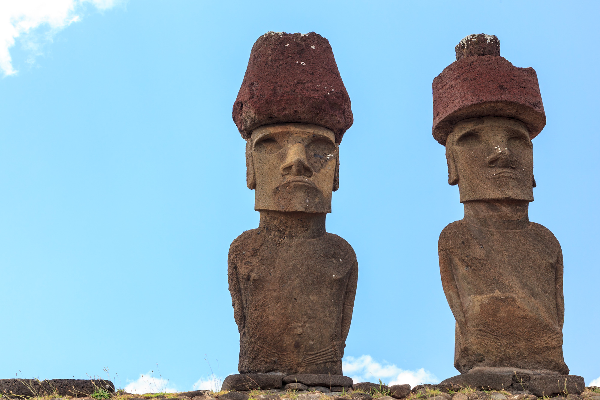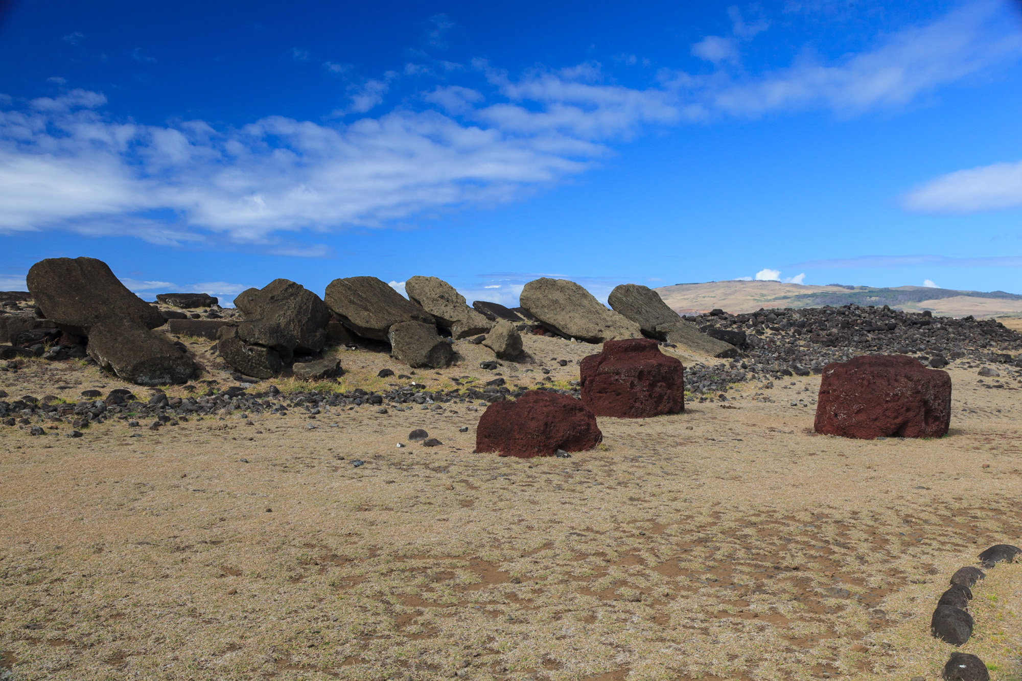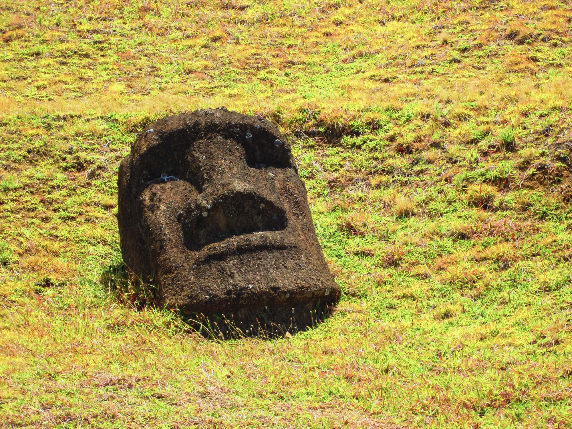 De nombreuses statues ont été couchées par les intempéries et progressivement ensevelies. Ici, on voit des têtes sortir de terre, droites ou penchées. Le retour des morts-vivants version Rapa Nui. Chez d'autres, seul le visage émerge, comme pour pouvoir prendre leur respiration dans cette mer d‘herbe verte. On dirait des titans de pierre qui ont régné sur le monde il y a très longtemps, et qui pour une raison mystérieuse, se sont endormis. Ils se sont figés. Ils attendent un signal, une formule magique pour se réveiller.