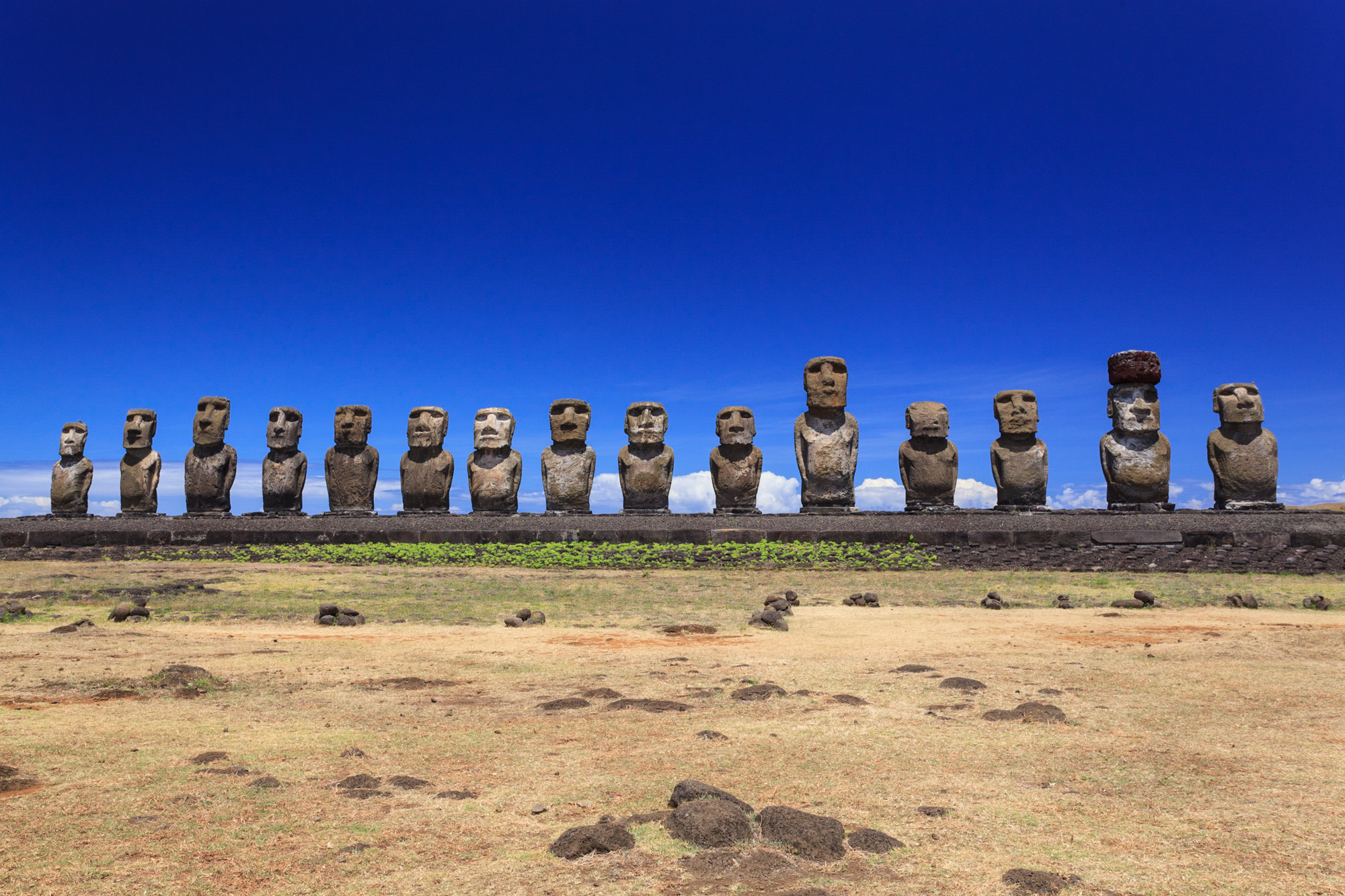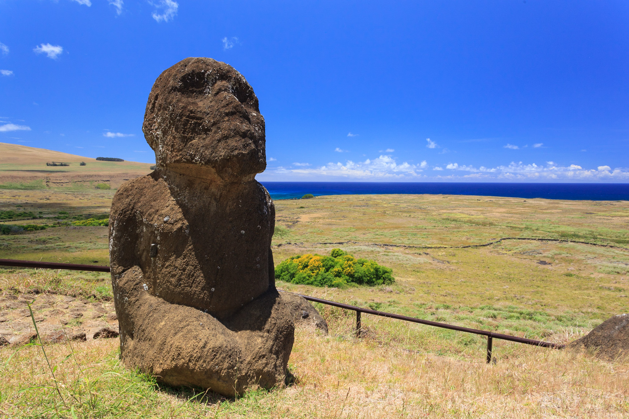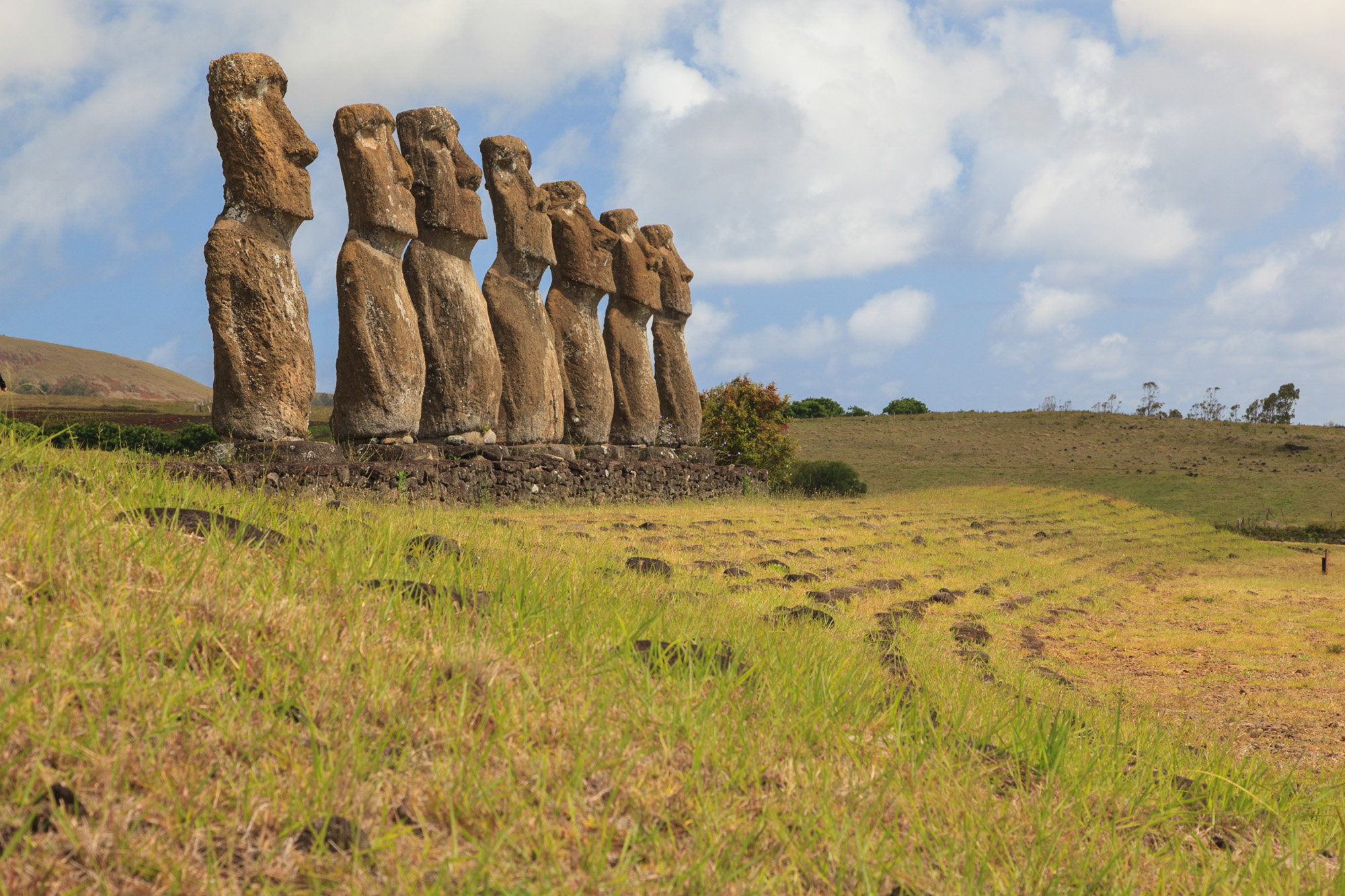 De nombreuses statues ont été couchées par les intempéries et progressivement ensevelies. Ici, on voit des têtes sortir de terre, droites ou penchées. Le retour des morts-vivants version Rapa Nui. Chez d'autres, seul le visage émerge, comme pour pouvoir prendre leur respiration dans cette mer d‘herbe verte. On dirait des titans de pierre qui ont régné sur le monde il y a très longtemps, et qui pour une raison mystérieuse, se sont endormis. Ils se sont figés. Ils attendent un signal, une formule magique pour se réveiller.