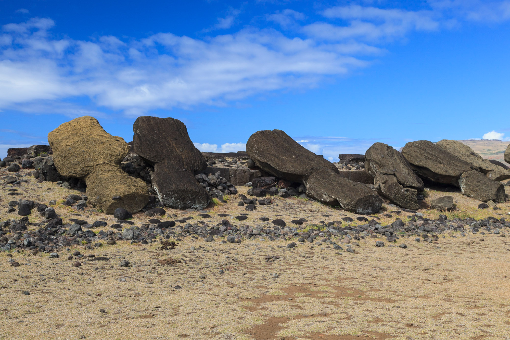 Nous enchaînons les sites où nous constatons le triste effet des guerres tribales sur les Moais. Ils gisent là, face contre terre, le Pukao a roulé plus loin. En tombant, ils se sont quasiment tous brisés au niveau du cou, le "talon d'Achille" du Moai. Tous les Moais de l'île sans exception ont été renversés. Les quelques dizaines qui sont debout ont été redressés.