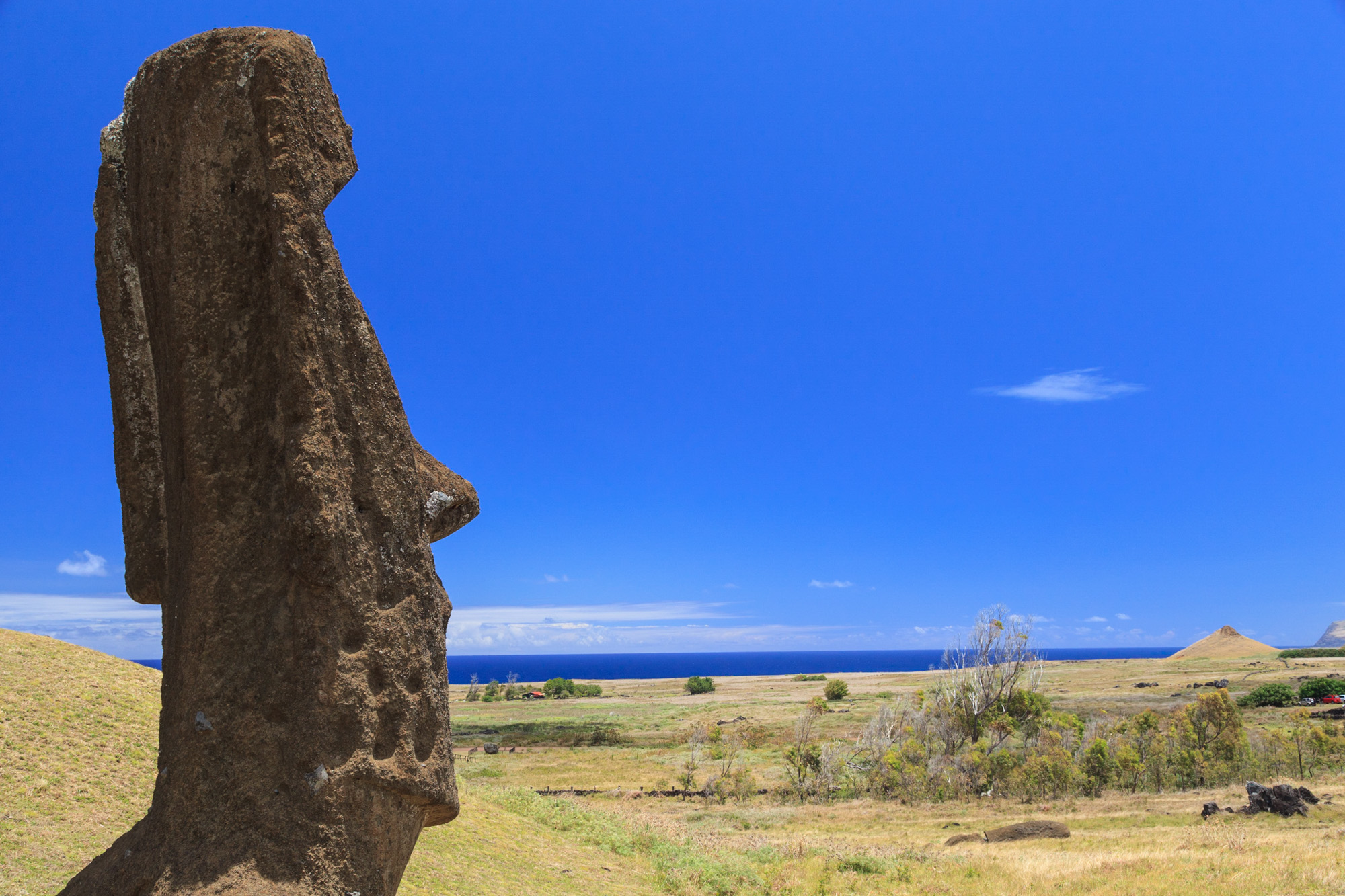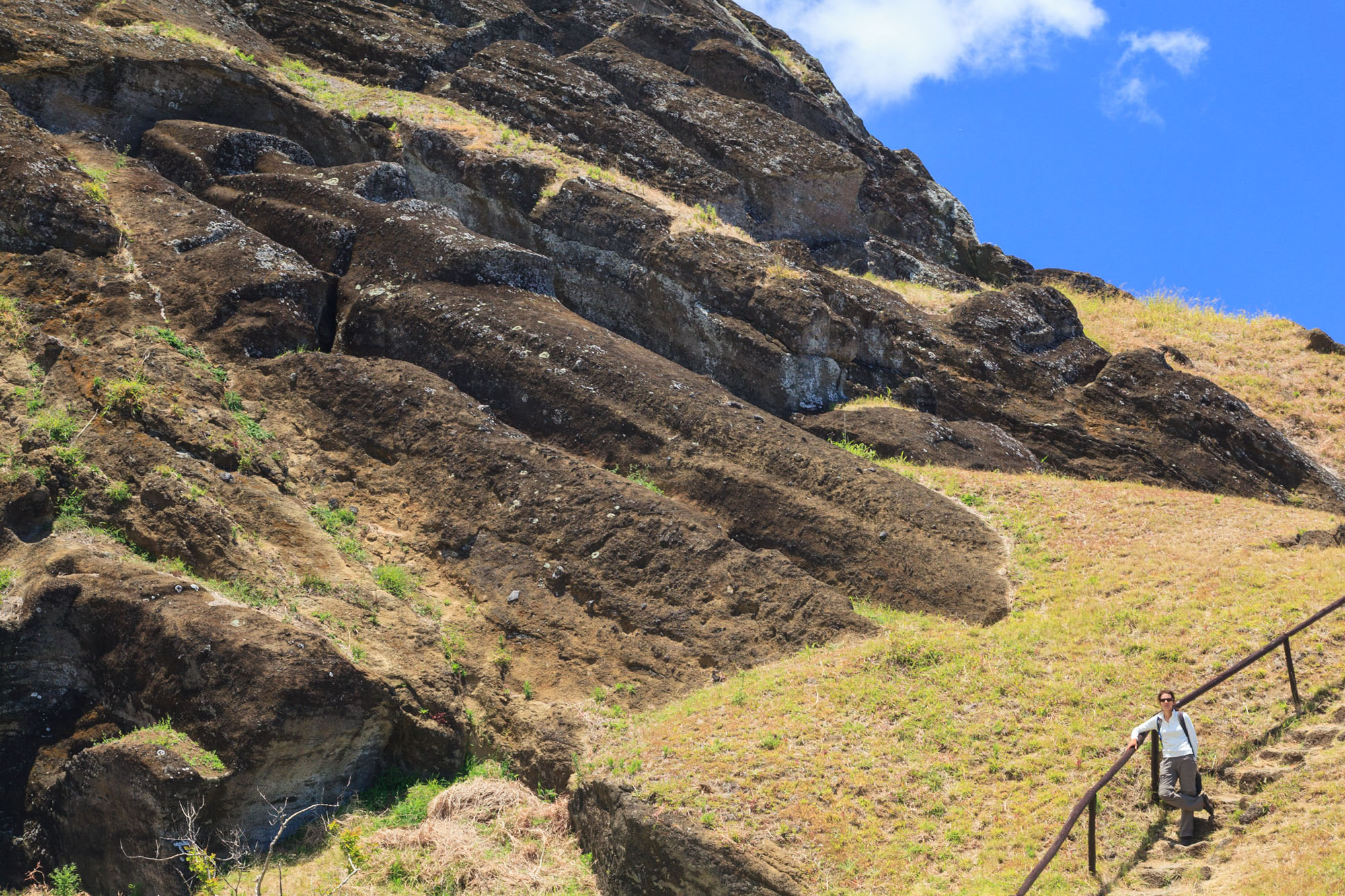 Nous arrivons en début d'après-midi au saint des saint de l'île, là où tout a commencé: la carrière de fabrication des statues. La carrière est en fait le volcan Rano Raraku. Les sculpteurs pascuans taillaient les statues directement dans son flan avec des pics et des haches de basalte poli. Il règne ici une ambiance particulière. Lorsque les Pascuans abandonnèrent le culte des Moais, ils stoppèrent du jour au lendemain la fabrication des statues. Ces dernières sont restées là, en l'état. Certaines étaient en train d'être acheminée à leur ahu et ont été laissées sur le bord de la route. D'autres, en cours de construction ou de polissage, sont restées inachevée. Le plus grand Moai en cours de construction est encore dans sa gangue de pierre. Cette statue aurait dû faire 21,60 m et peser 180 tonnes. Intransportable !