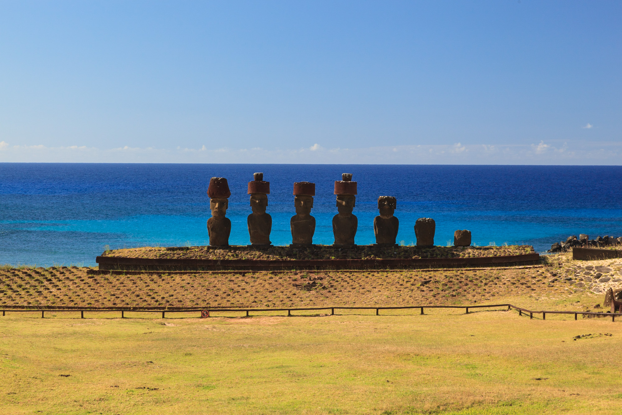 A Anakena, il y a aussi un très bel Ahu avec des Moais exceptionnellement bien conservés. Ces derniers ont été renversés comme tous les autres mais ils ont très rapidement été ensevelis dans le sable qui a empêché leur altération. Une colline permet de les photographier de face avec la belle plage en arrière-plan. Sublime!