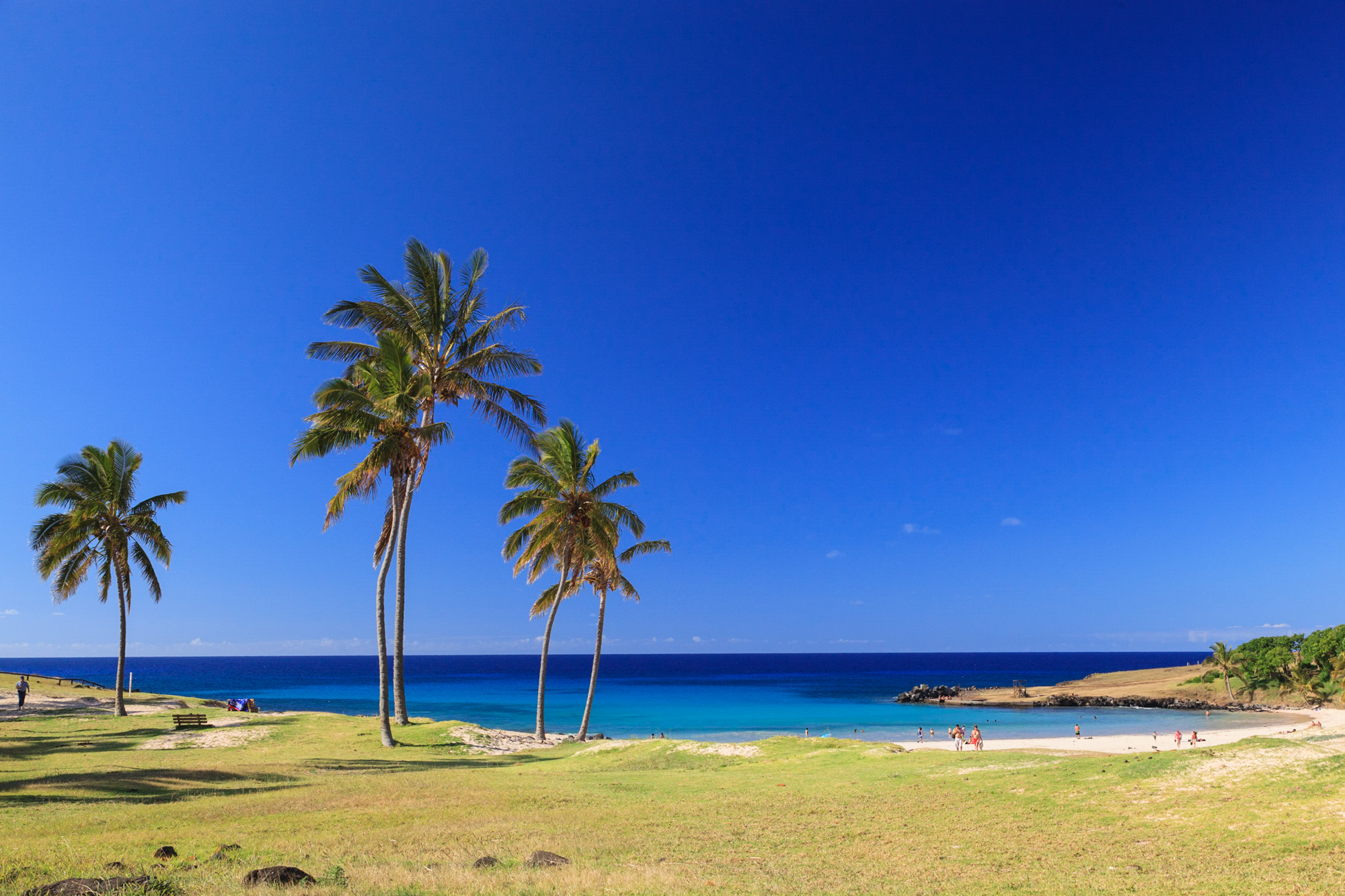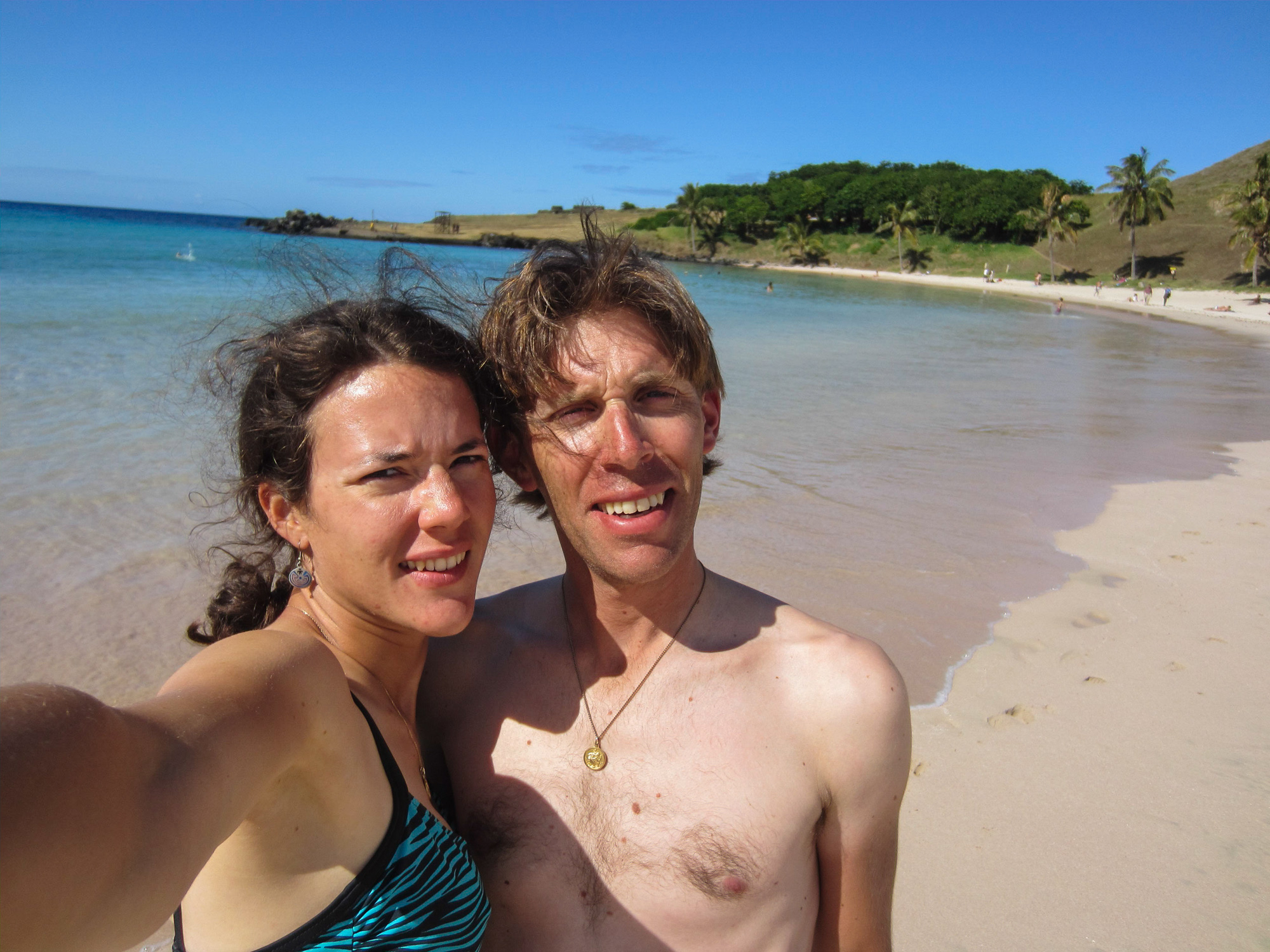 Nous atteignons après 4 heures le bout de l'île, matérialisé par la plage d'Anakena, la seule de l'île. Des eaux bleues cristallines. Une vraie plage de Polynésie avec ses cocotiers. Vision paradisiaque.