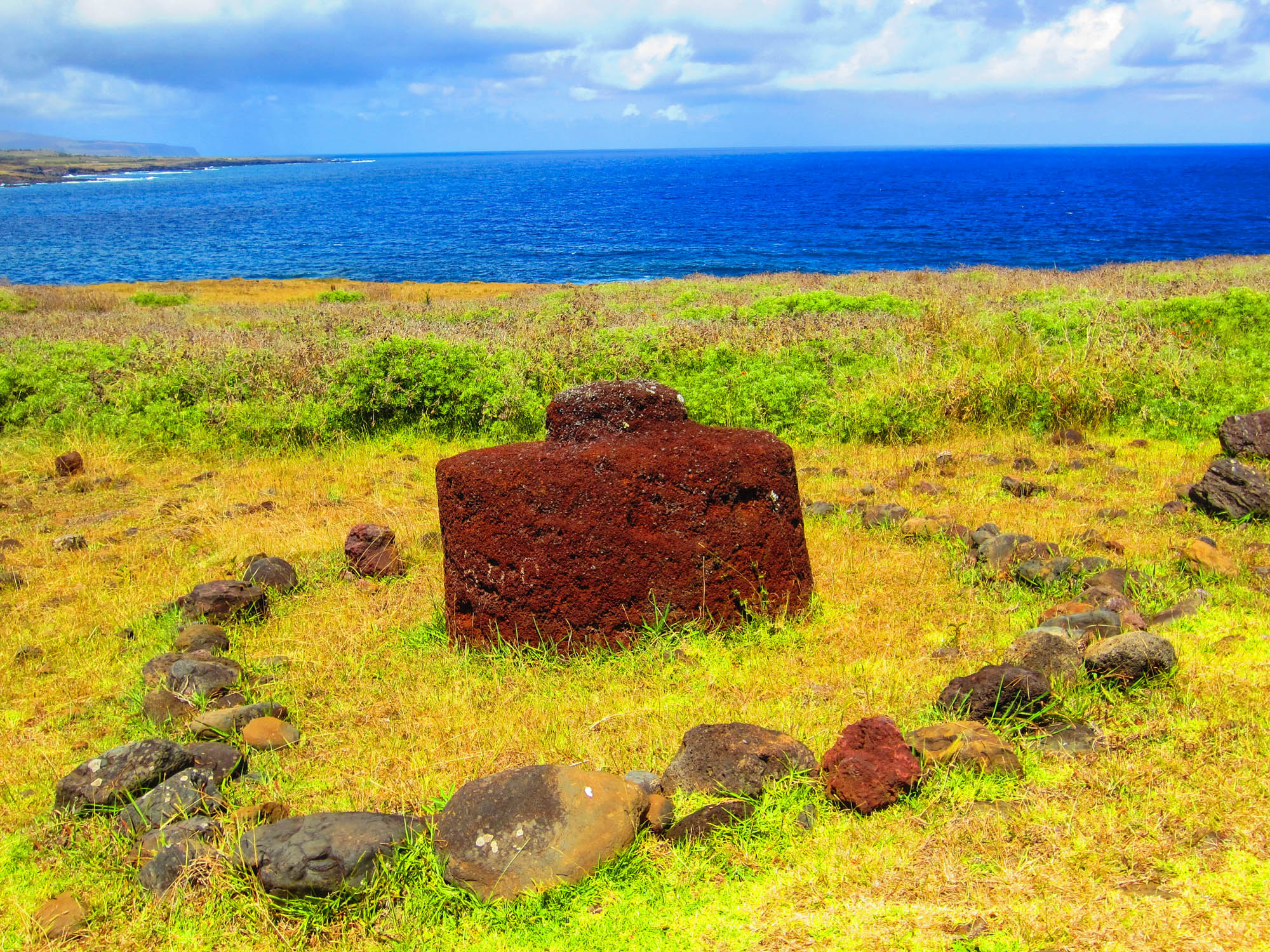 Nous commençons la visite par un site non loin d'Hanga Roa. Il s'agit d'une plateforme cérémonielle (*Ahu*) dont les statues de pierre ont été renversées. Keka nous explique ce que dit la tradition orale. Devant chaque Ahu, il y avait un village presque exclusivement situé sur la côte pour un accès direct à la mer. Quand un représentant important du village mourait, on l'enterrait sous l'Ahu. Une statue de pierre était immédiatement commandée, qui devait représenter la personne décédée, ce qui explique pourquoi les Moais ont un visage légèrement différencié au niveau du dessin des yeux, du nez et des lèvres. Certain ont aussi plus de bide que d'autres. Chaque statue avait un nom.