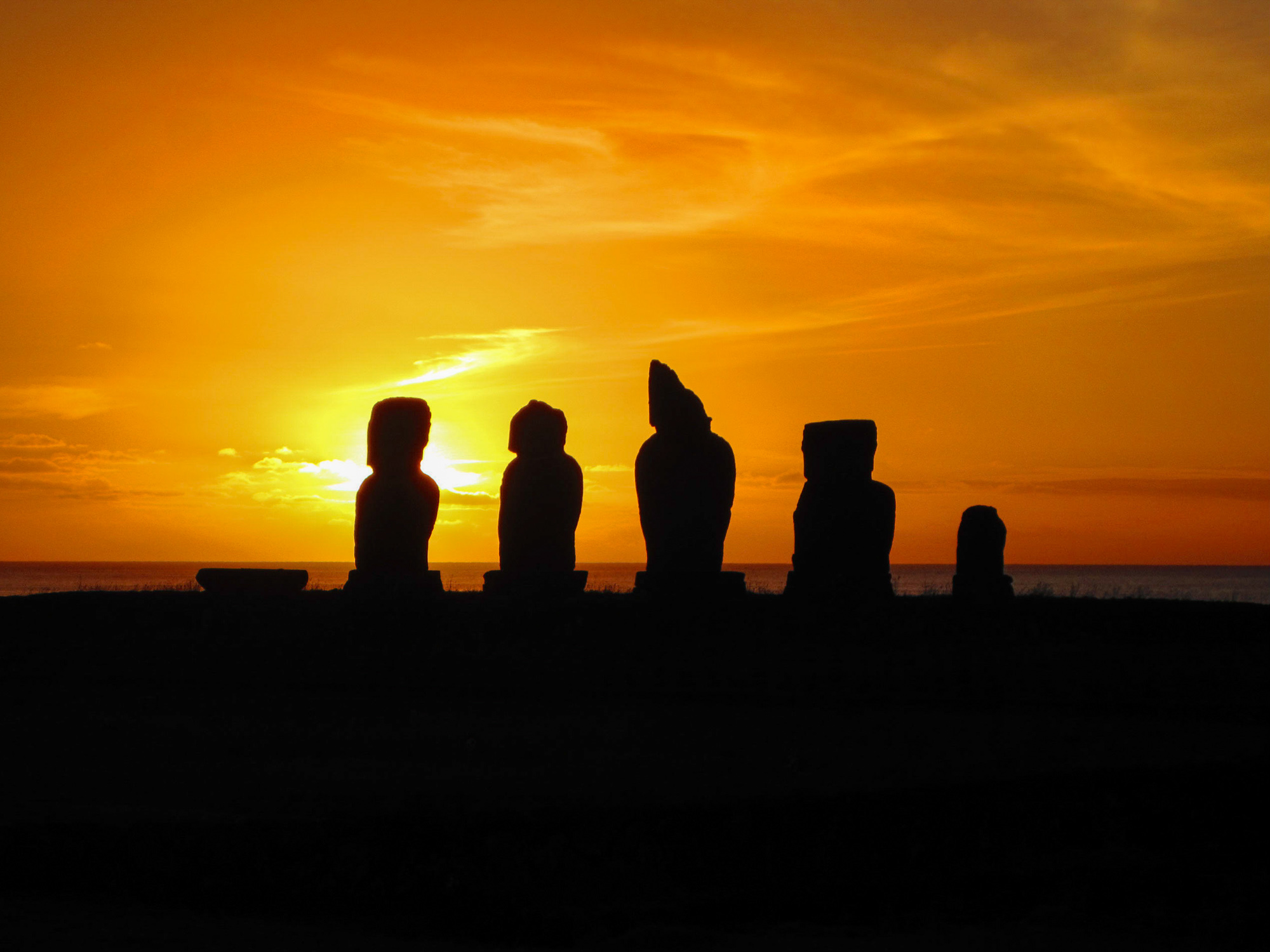 Ce soir, nous allons sur le port pour assister au coucher de soleil. Nous prenons des dizaines de photos de Moais sur fond d'astre déclinant. Féerique!