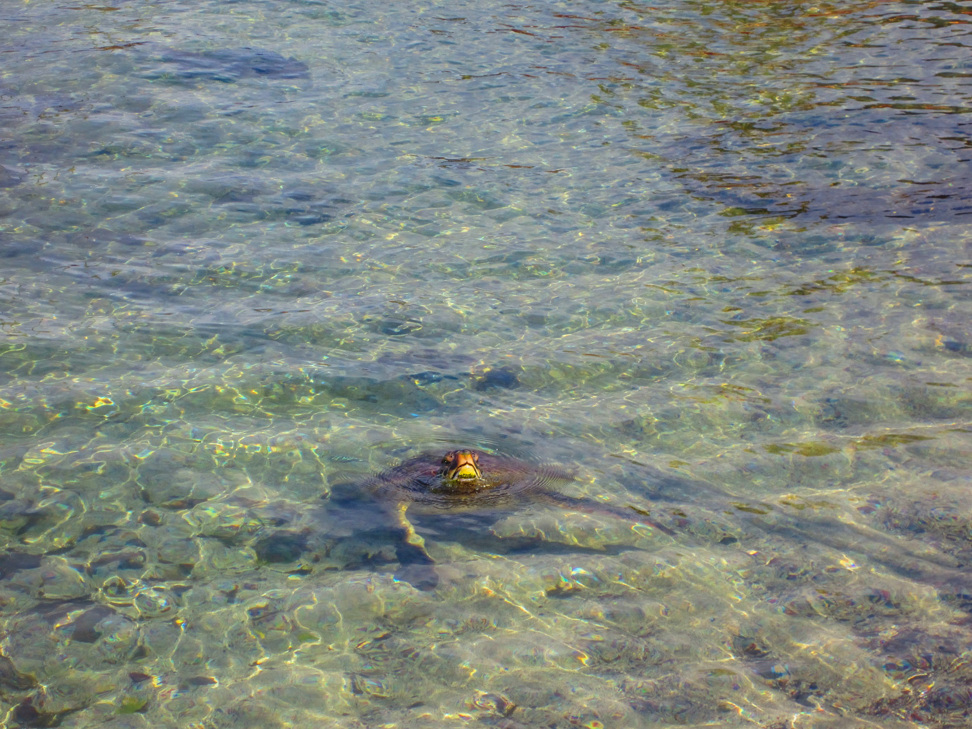 Une fois revenus et le scooter rendu, nous nous rendons une dernière fois sur le petit port d'Hanga Roa, car nous n'avons pas encore pris de photo de cet endroit pourtant bien sympathique. L'île de Pâques nous fait alors un dernier cadeau. Alors que nous regardons la série de vagues sur lesquelles des surfeurs s'entrainent, nous apercevons une tortue de mer sortir de l'eau. Elles se comptent sur les doigts de la main autour de l'île et celle-ci nous fait l'honneur d'une apparition.