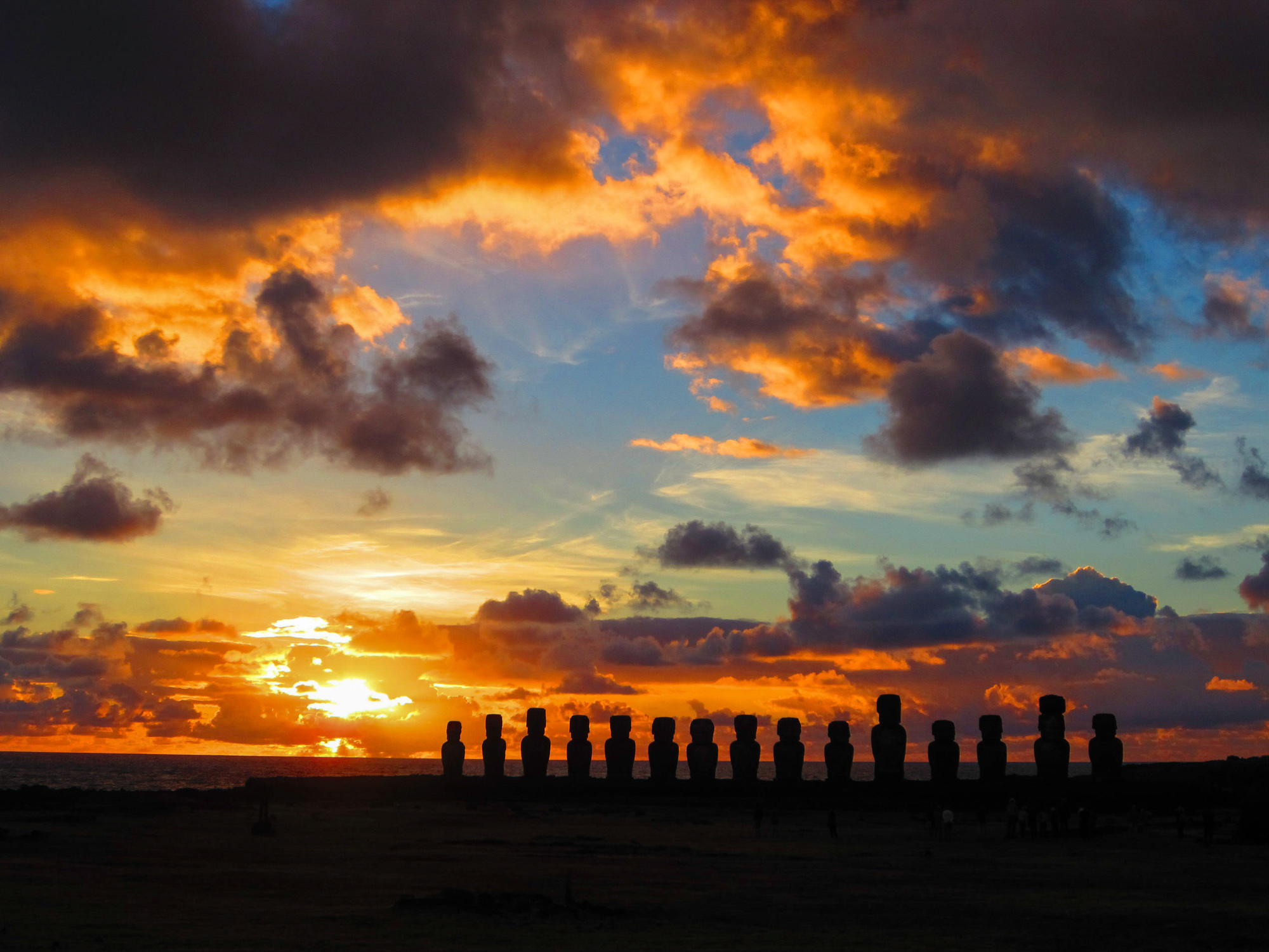 Jour 6... on doit repartir cet après-midi... mais on compte bien profiter des beautés de Pâques (et de notre location de scooter) jusqu'à la dernière minute. Après le coucher de soleil, nous tenons à voir un lever de soleil. C'est beaucoup plus compliqué (car il faut être motorisé) et surtout il faut se lever très tôt. Bref, on saute (enfin, le verbe est plutôt mal choisi) du lit à 5h pour un *ride* d'une demi-heure en pleine nuit. Une fois Hanga Roa derrière nous, nous ne voyons plus grand-chose. Nous prenons la route de la côte sud pour joindre le site de Tongariki, celui des quinze Moais. A notre droite, on devine l'océan au bruit de son ressac et au mouvement de la masse noire dans la faible lumière du phare. Ca n'est pas rassurant, les flots qui bougent dans la nuit. En plus, la pensée que c'est par ce côté qu'est arrivé le dernier tsunami m'obsède. Je ne peux m'empêcher de penser que si la vague scélérate arrive, on ne pourra rien faire pour y échapper. Oui, on se monte bien le bourrichon avec des idées stupides... Le chemin parait bien plus long de nuit que de jour. On redoute la traversée de chevaux sauvages à la sortie d'une courbe ou la glissade sur de la boue, car il commence à tomber des gouttes. Nous arrivons enfin, mais bien trop tôt. Nous sommes les premiers sur le site après avoir suivi les conseils de Matthias. Du coup, on se gèle pendant une bonne heure et demi avant que le disque solaire veuille bien faire son apparition. Mais, quand il arrive, c'est un véritable feu d'artifices. Du rouge, du orange, du jaune, du gris, du bleu. Une bonne centaine de photos...on va galérer pour le tri.
