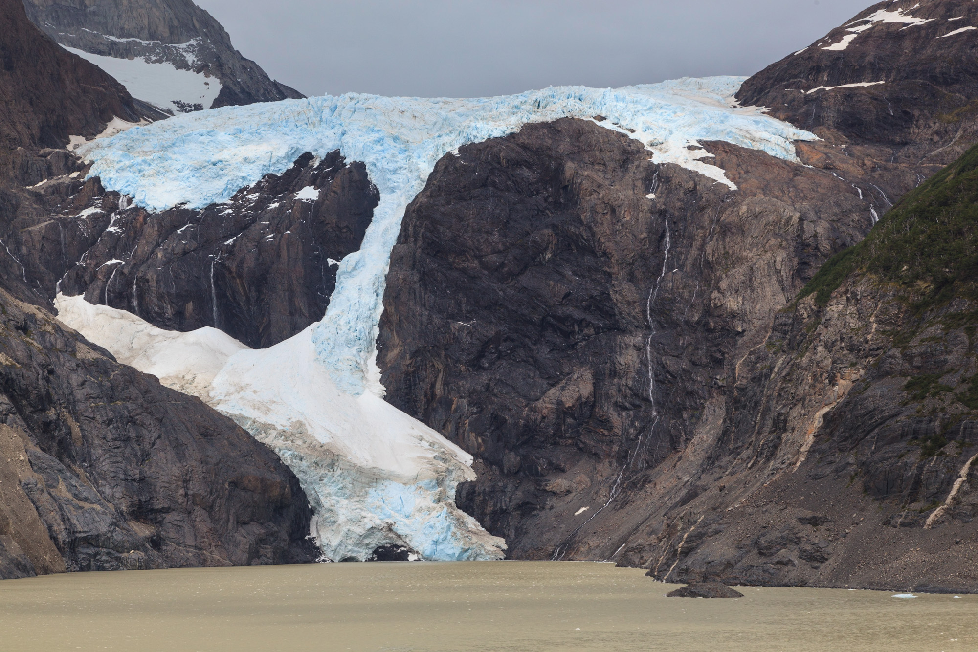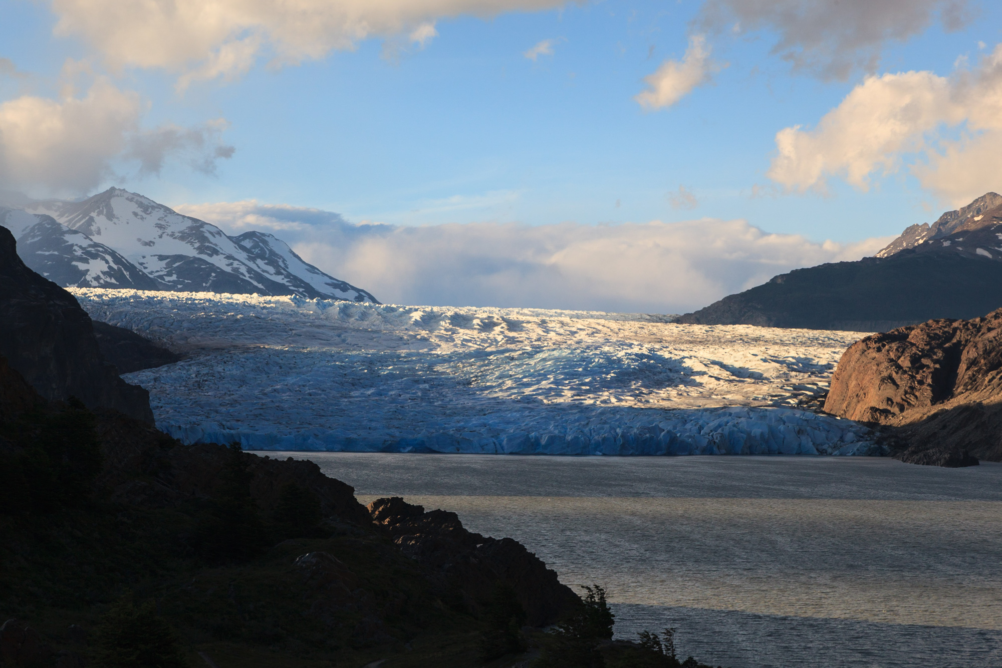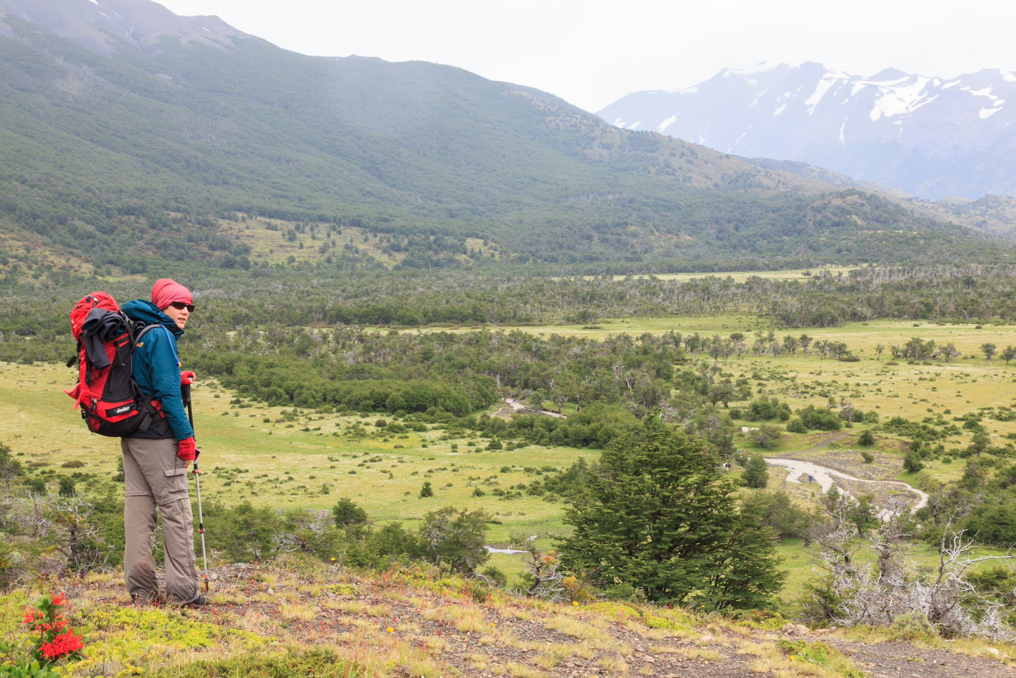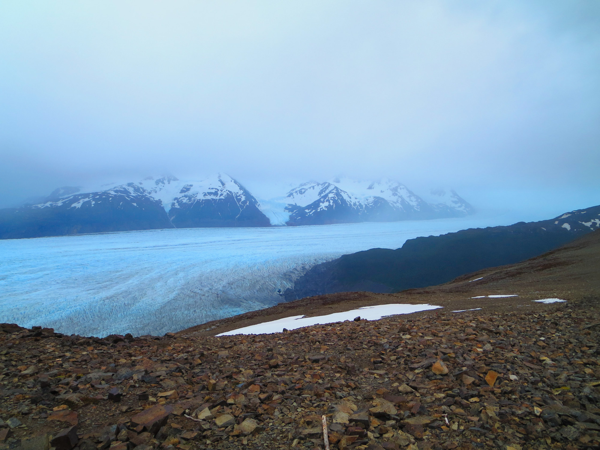 Nous arrivons en haut après plusieurs heures d’ascension. Ce qui est impressionnant avec les passages de col, c’est la différence des paysages entre les deux vallées qu’il séparent. On a toujours le sentiment de passer d’un monde à un autre. Derrière notre col du jour s’étend le glacier Grey. Il est dans la brume aujourd’hui. Nous espérons pouvoir l’admirer plus demain.