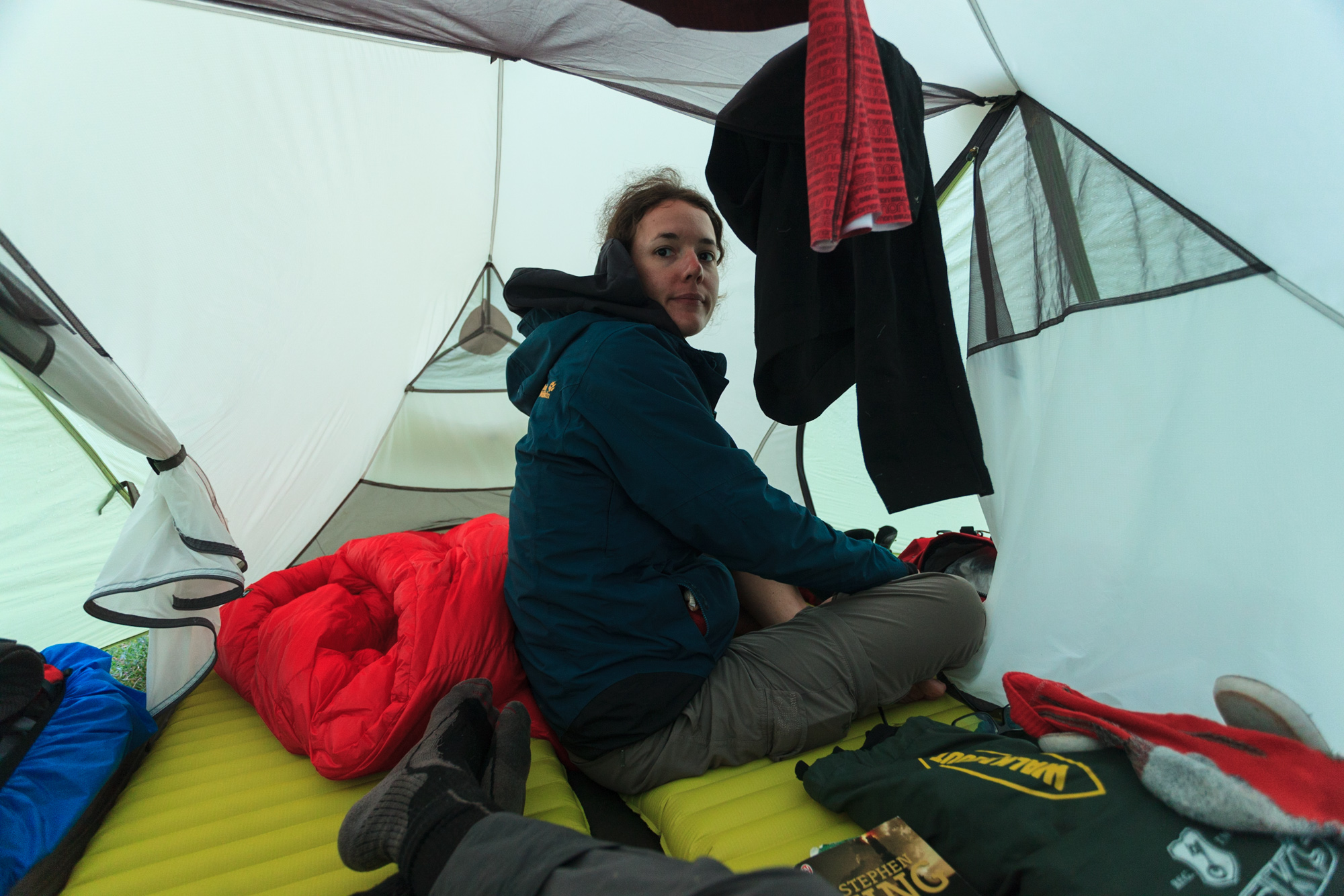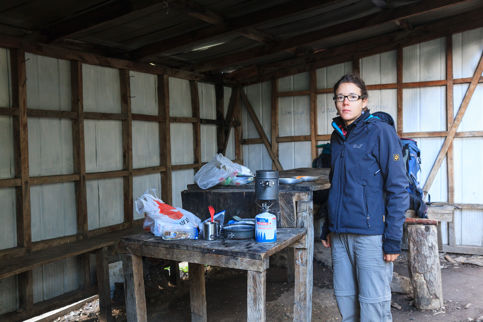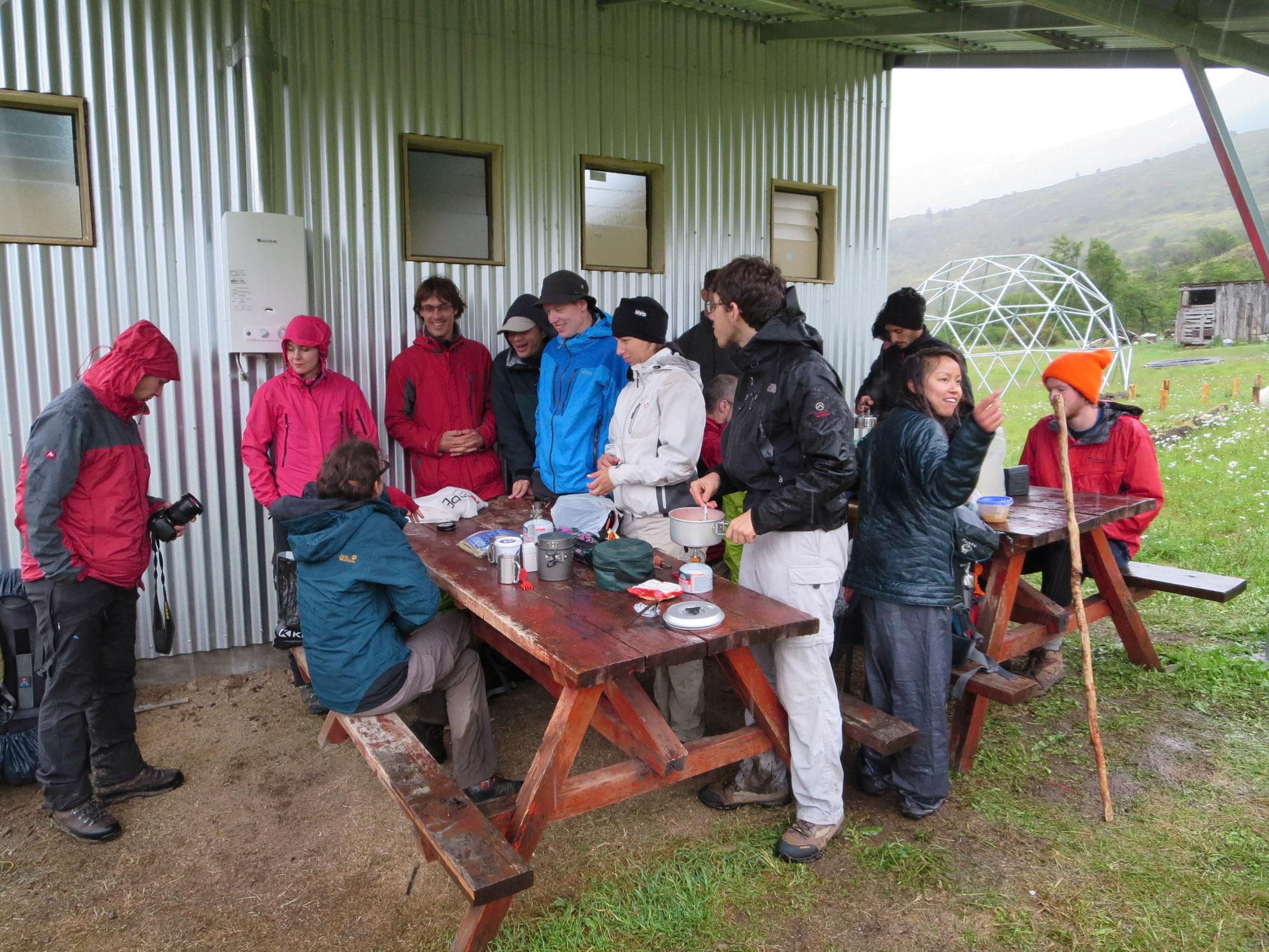 Nous montons la tente sous la pluie qui se renforce d’heure en heure. Sous le toit de taule qui abrite deux tables de pique-nique, nous sommes interpellés par Jarek, un Polonais installé en Nouvelle-Zélande. Il commente la météo: “j’ai beau y être habitué, je déteste toujours autant la pluie”. Nous faisons connaissance avec le reste de la clique: André (Australo-Polonais), Julius (Hollandais vivant en Nouvelle-Zélande) et Michael (Allemand). Incroyablement cultivés, tous polyglottes (Julius maitrise 7 langues, y compris le japonais), ces quatre-là ont toujours la patate et le mot pour rire. Une compagnie sympathique avec qui nous aurons énormément de plaisir à discuter lors de ce trek. Nous terminons cette journée joyeusement autour d’une soupe de pâtes en devisant sur Delicatessen, le film de Jeunet et Caro.