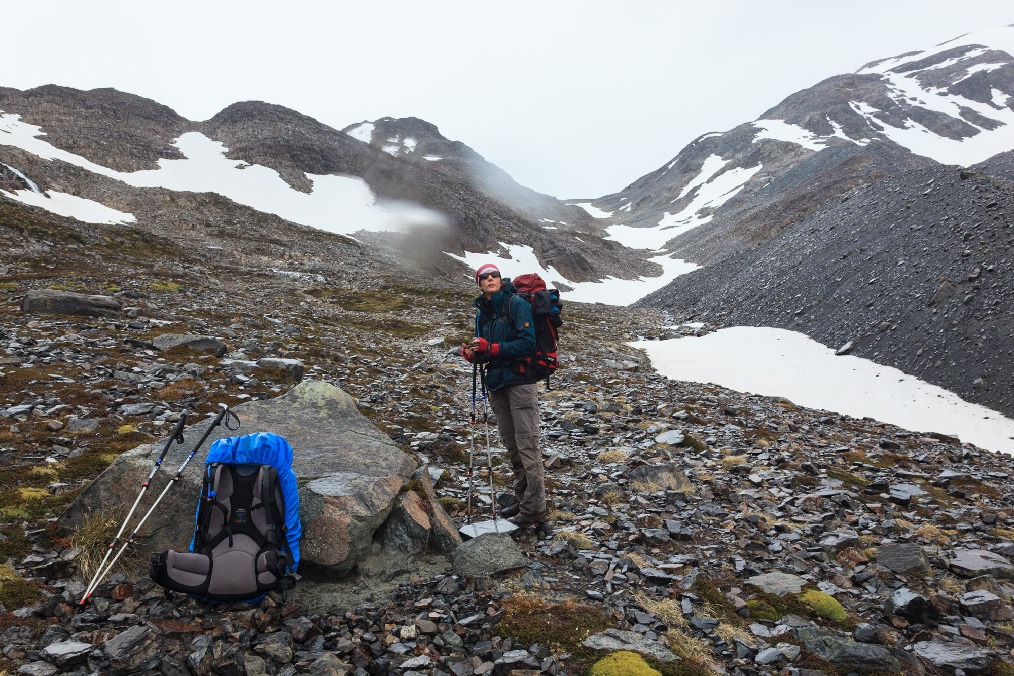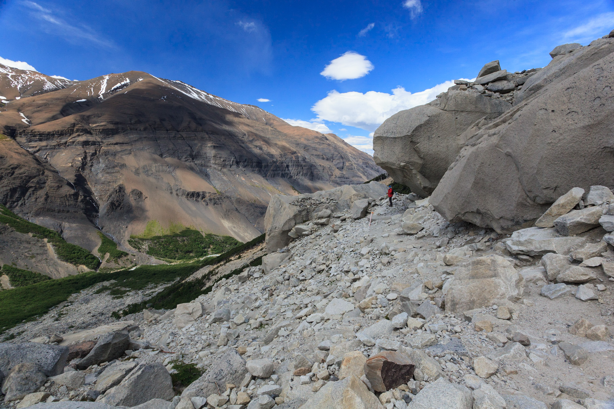 Nous passons dans une impressionnante vallée extrêmement ventée. On a du mal à tenir debout, une fois de plus. Au fond de la vallée, on attaque l’ascension finale, à flanc dans un immense pierrier aux blocs de roche titanesques.