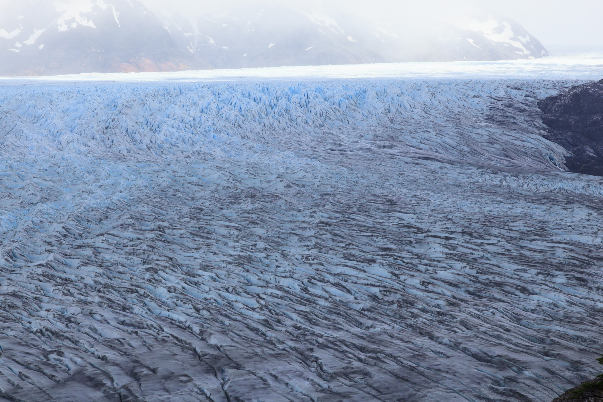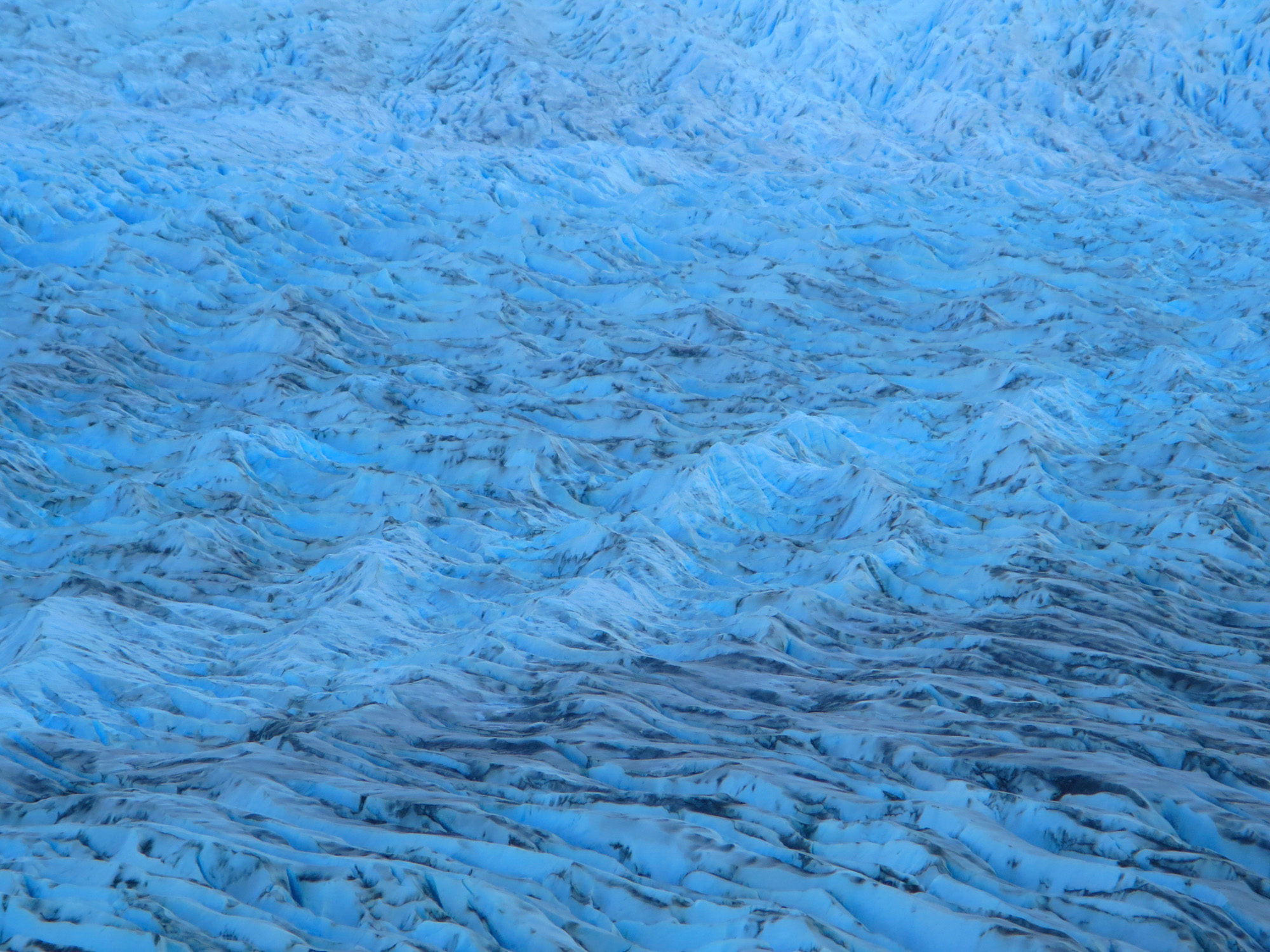 Nous passons de longues minutes à le regarder et à prendre des clichés. On redoute déjà l’opération tri des photos, tellement il incite au déclenchement. On dirait un immense fleuve impétueux dont on aurait figé les mouvements. On y détecte les courants principaux matérialisés par des lignes de moraines grisâtres, des tourbillons causé par les changements de relief des berges, et des vagues bleues formées par l’éclatement des blocs de glace en surface.