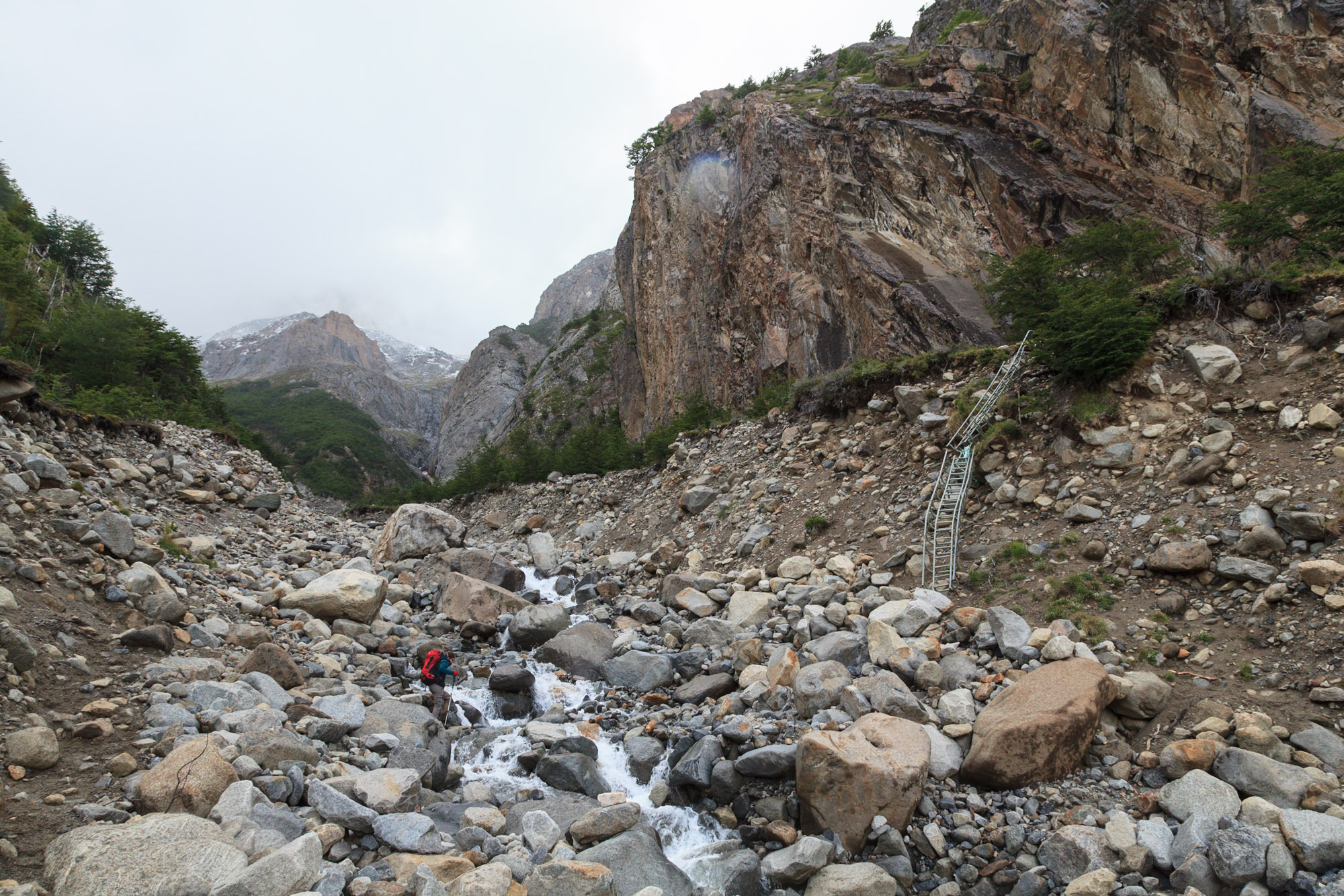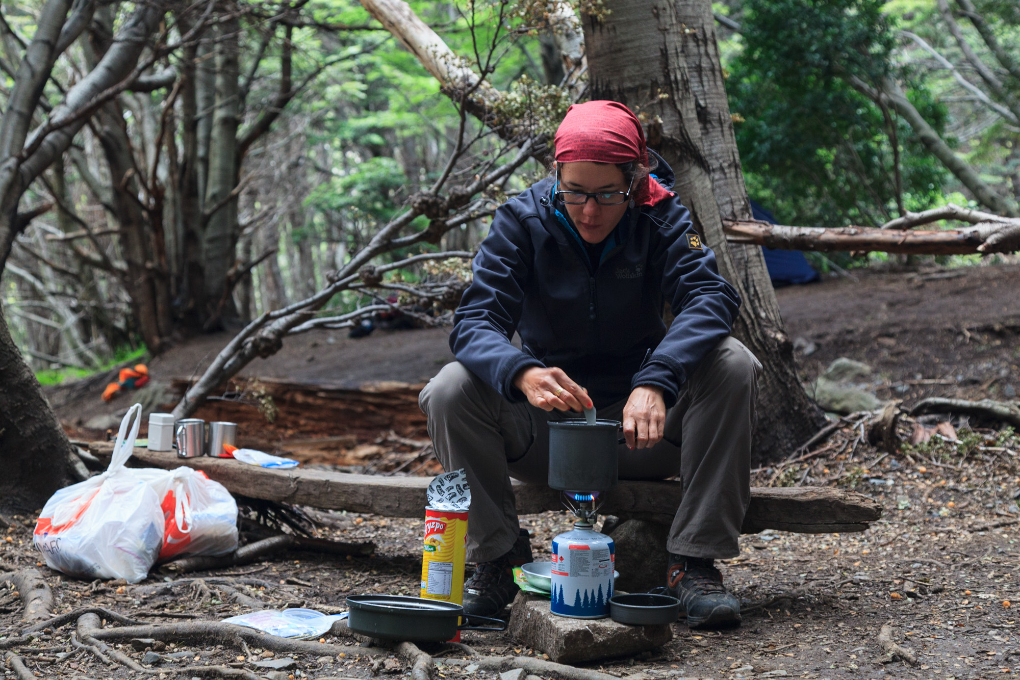 Nous reprenons le chemin pendant deux bonnes heures afin d’atteindre le Campamento Italiano. Situé sous une forêt humide et froide, ce camp gratuit est la porte d’entrée de la vallée du Français. Après avoir longtemps cherché, nous trouvons une place à côté d’un petit ruisseau, en face du couple danois-norvégien qui fait, lui aussi le tour complet des Torres.
