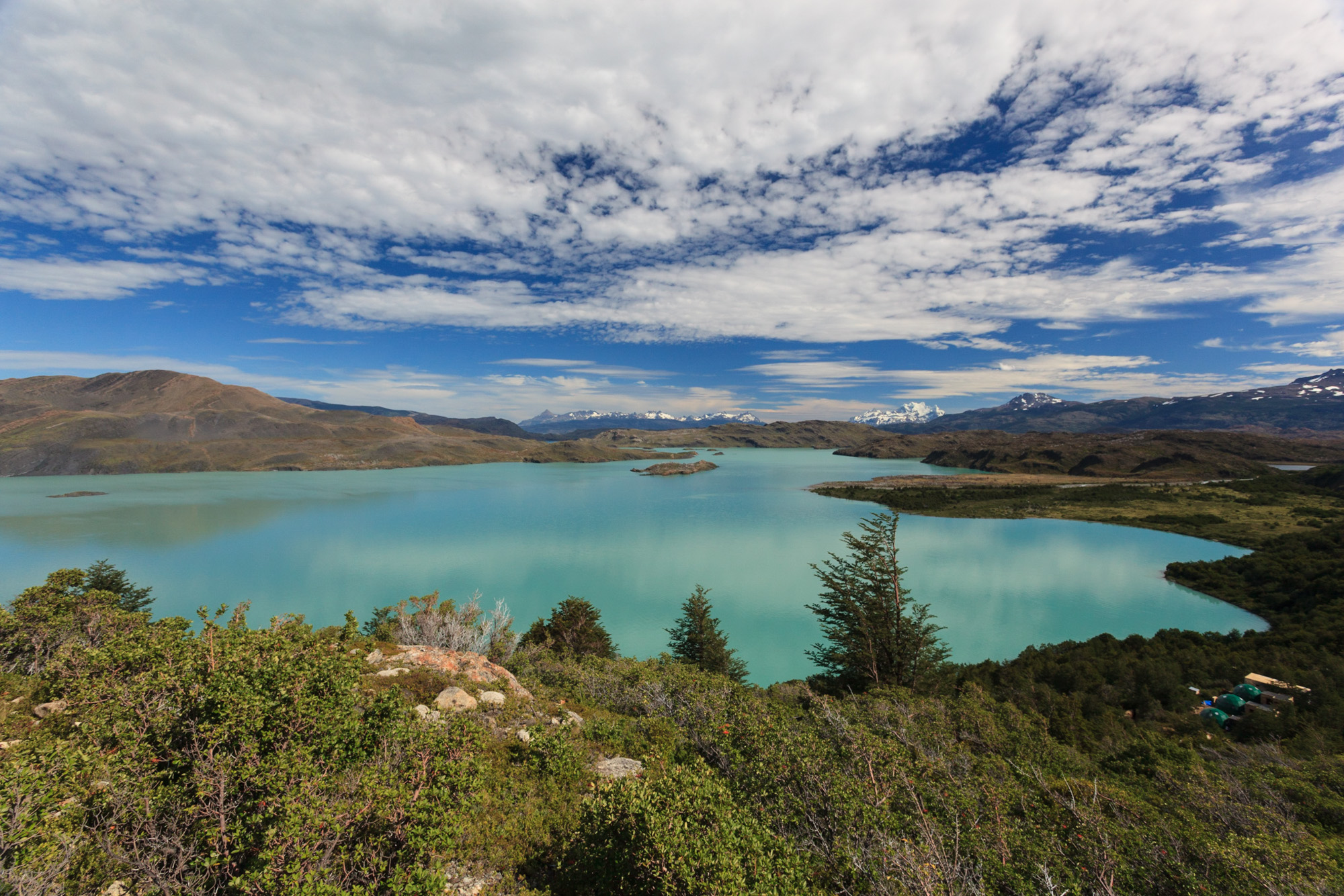 Nous parvenons au Campamento Dickson. Un camp situé dans un site incroyable. On y accède après être descendus à la verticale d’une falaise. Une grande prairie serrée entre deux lacs accueille les randonneurs fatigués. Les arbres en bordure nous abritent du vent. Ce soir, c’est purée aux herbes… et aux moucherons qui nous attaquent par escadrilles. On rentre bien vite dans la tente.