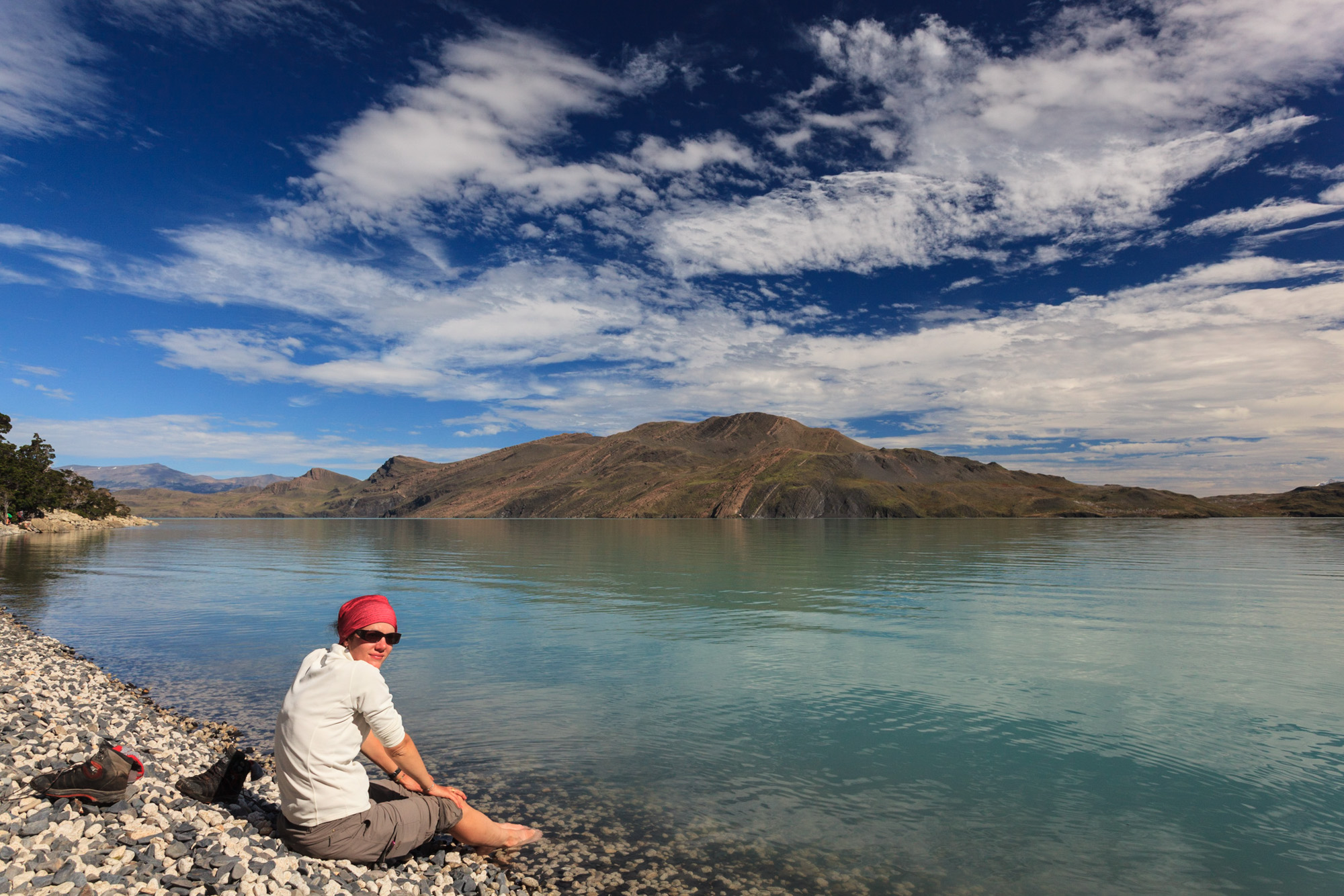 Nous redescendons, récupérons nos affaires (ouf, elles sont là !) et poussons jusqu’au Campamento Los Cuernos. La journée est magnifique, pas un poil de vent. On a de forte chance de retrouver les parents de Nicolas. Le camp de Los Cuernos est situé juste après un lac aux eaux claires bordé de plages de galets. Sur la plage, ça fleure bon les chaussettes pourries par cinq jours de randonnée dans la boue. Bref, ça pue des pieds ! Tout le monde a eu le même réflexe, certes bizarre, mais non moins compréhensible de retirer ses chaussures de rando pour plonger les pieds dans l’eau. Elle est gelée mais son appel cristallin est irrésistible. Le Norvégien, conditionné par ses gènes scandinaves, y plonge le corps entier. Pour vous donner une idée de la température, l’eau du lac provient directement des glaciers…