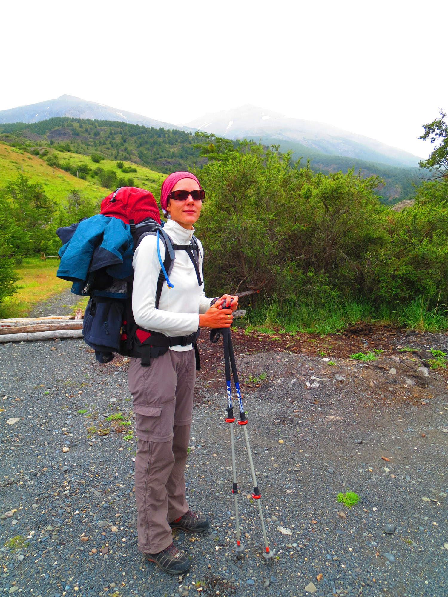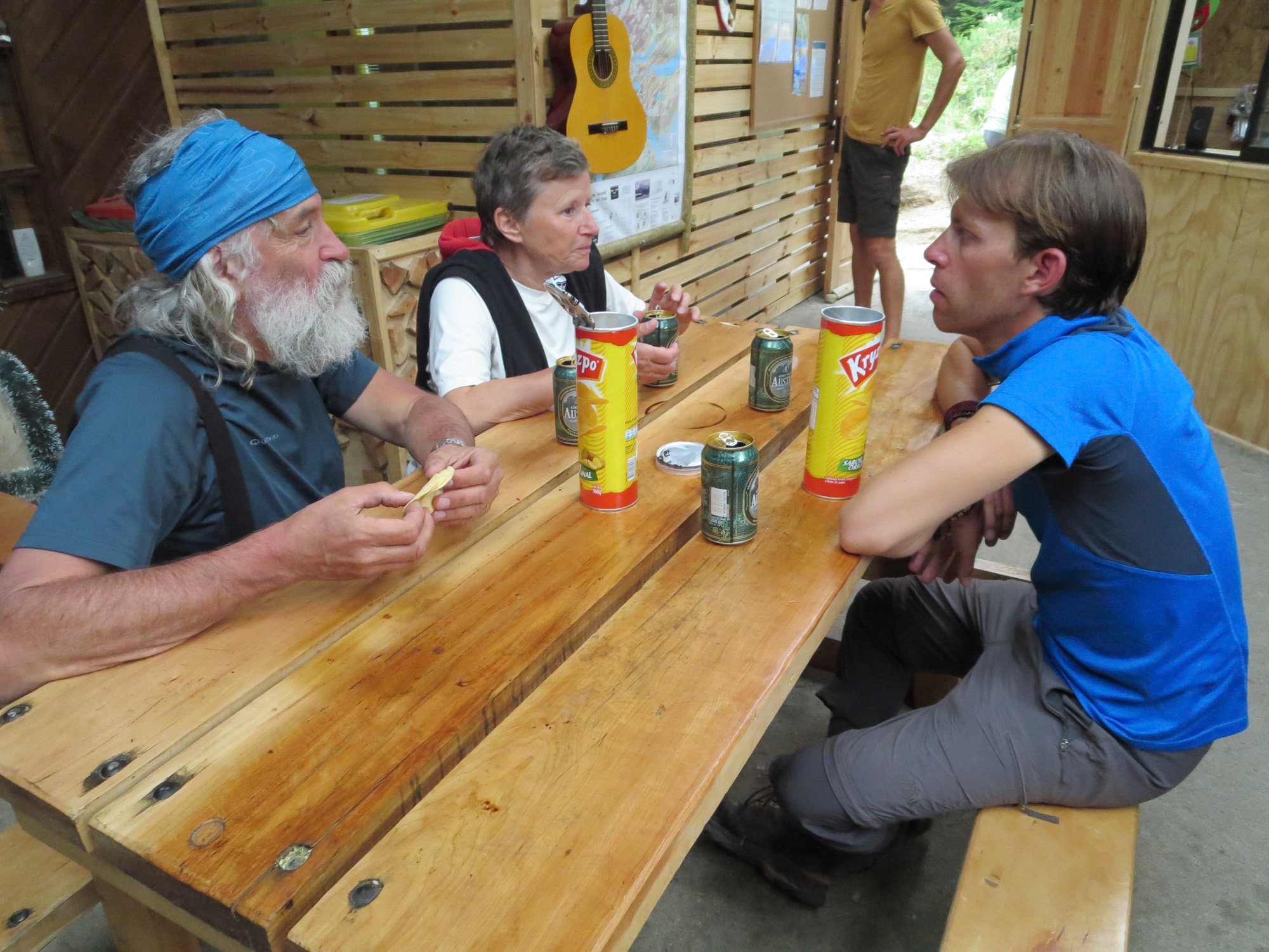 Juan est aussi loueur de matériel de randonnée. Du coup, dans son auberge, il y a de grands espaces qui permettent d’étaler le contenu de son sac, en faire l’inventaire et prendre le strict nécessaire pour le trek. Une grande carte du parc des Torres del Paine avec les temps de marche, les refuges et les moyens de transport pour joindre les départs de rando nous permet de faire le point sur notre programme et nos besoins en pesos chiliens. Juan et son amie française en visite nous donnent plein d’informations utiles.