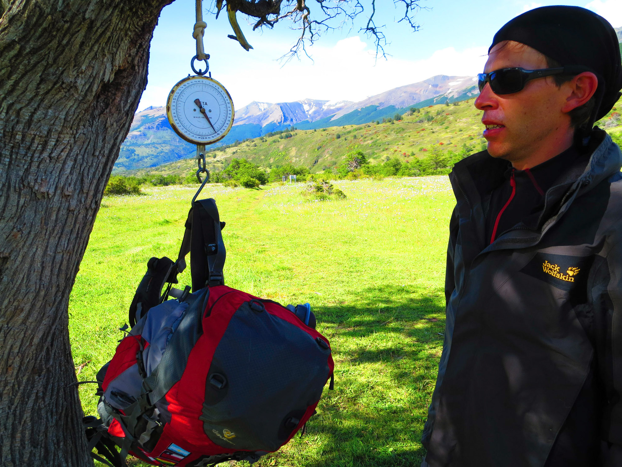 Une balance accrochée à un arbre nous permet de confirmer ce dont nous avions un vague soupçon. Nos sacs sont beaucoup trop lourds. 13kg pour moi et 20 kg pour Nicolas!!!