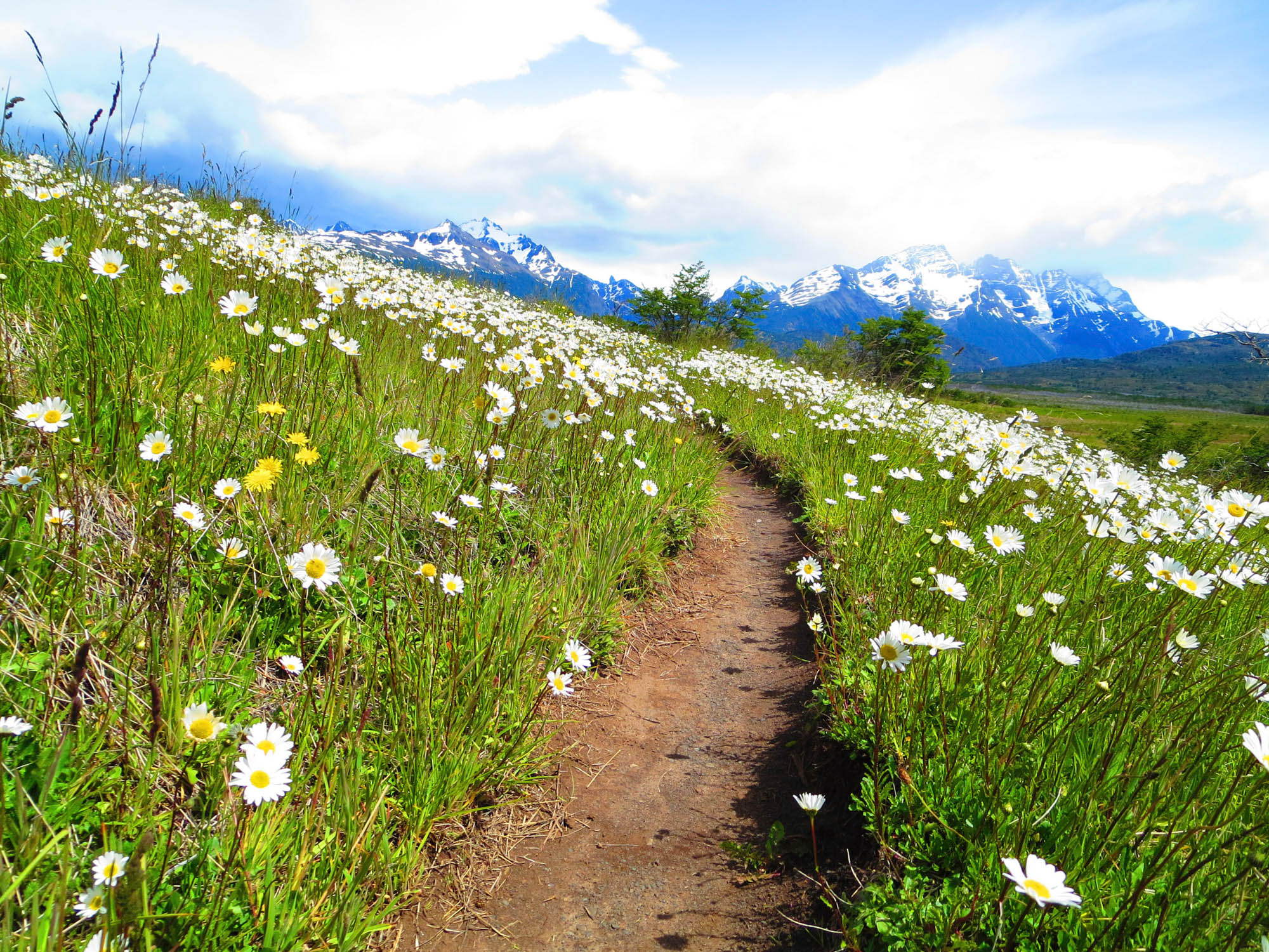 Nous pérégrinons sur des collines par des chemins boueux en longeant des barrières en fil barbelé. Chose curieuse, cette partie du parc est privatisée. Pas vraiment le sanctuaire que nous avions imaginé. Vers le milieu de la journée, nous atteignons une plaine plantée de millions de marguerites. Des touches de blanc dans le paysage gris. Le temps ne s’arrange pas: la bruine s’est transformée en pluie régulière.