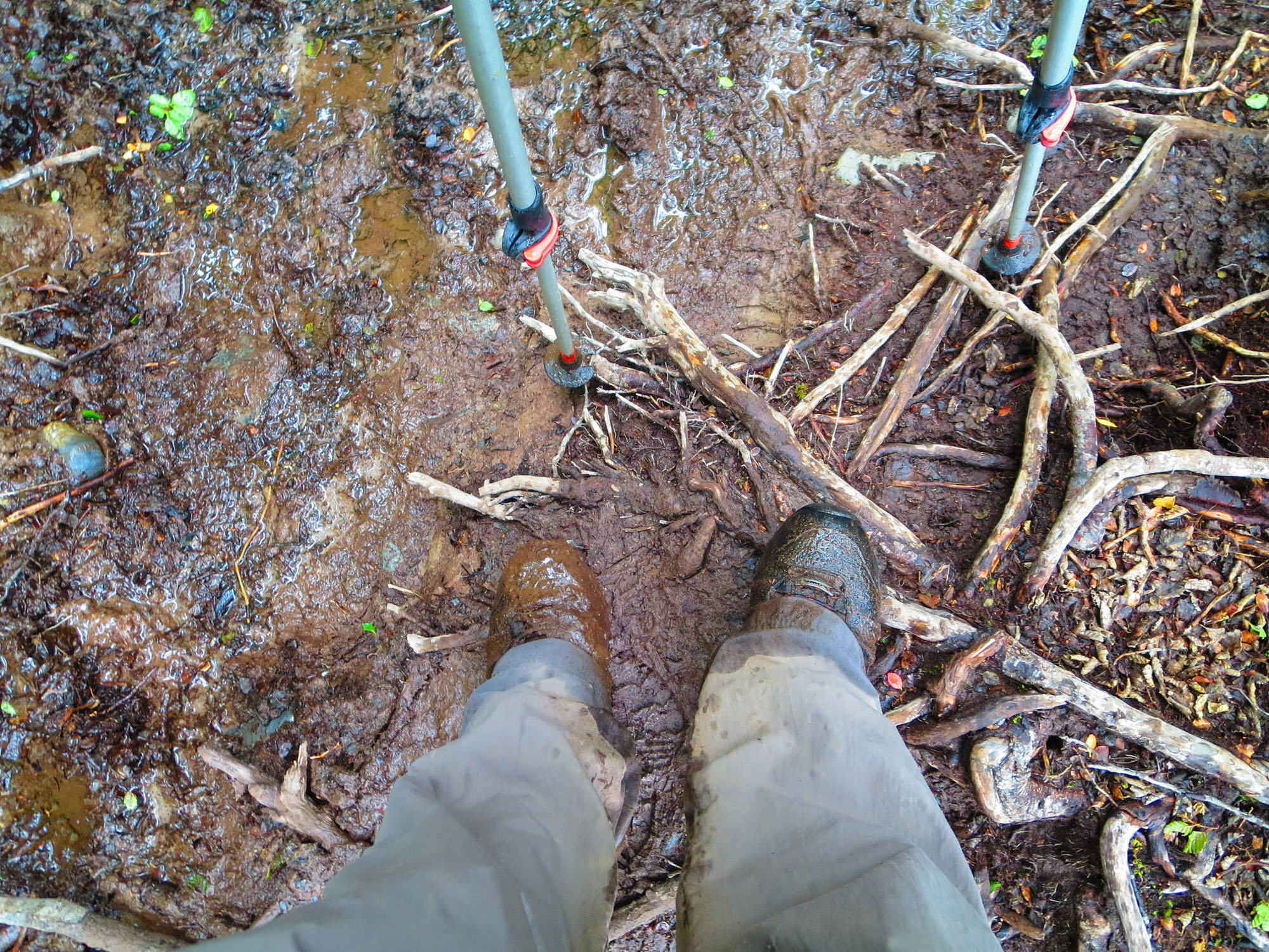 Pas de regret concernant le camp. Sombre et humide, il parait limite sinistre avec la pluie qui s’invite de nouveau en cette fin de matinée. Nous profitons, cependant, du terrain plat pour déjeuner. Parce qu’après, ça grimpe de façon ininterrompue jusqu’au col. Le chemin que nous empruntons est abominable. Accrochée aux pentes boisées de la montagne, la sente est un véritable bourbier. Les planches en bois qui aidaient à la progression ont été englouties. Par endroits, le chemin est carrément impraticable et de nouveaux chemins ont été créés qui partent dans toutes les directions et qui mènent parfois… à rien. Nous perdons du temps sur ce tronçon à retrouver des marquages et à essayer d’échapper en vain au “gaugeage”.