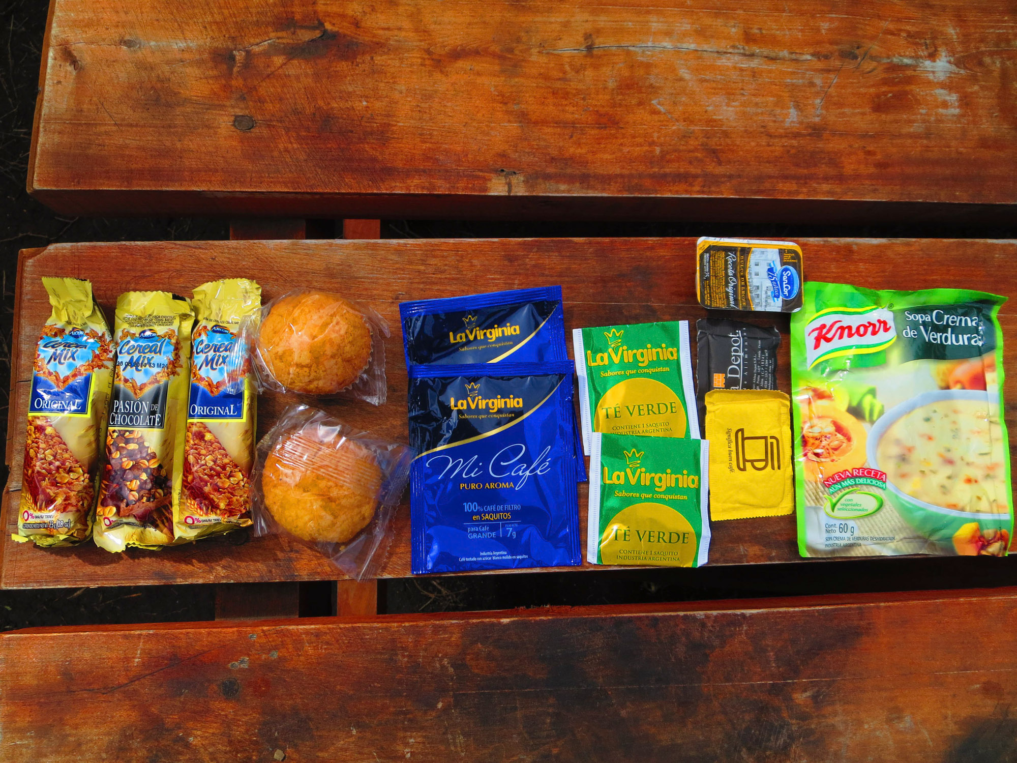 Avec Michelle qui va nous rejoindre plus tard sur le trek, nous constituons des rations journalières que nous enfermons dans des sacs de congélation zippables. Au menu, café, thé, sucre, dosettes de confiture et de dulce de leche, céréales et lait en poudre pour le petit-déjeuner. Pour le déjeuner, salami, tranches de fromage et un gâteau dit de “Pâques” trouvé à Noel dans un supermarché de Puerto Natales. C’est bourré de fruits secs et ça évoque plutôt le Christmas Pudding anglais. Un véritable étouffe-chrétien. Le soir, c’est soupe instantanée, purée mousseline et petites madeleines pour le réconfort.