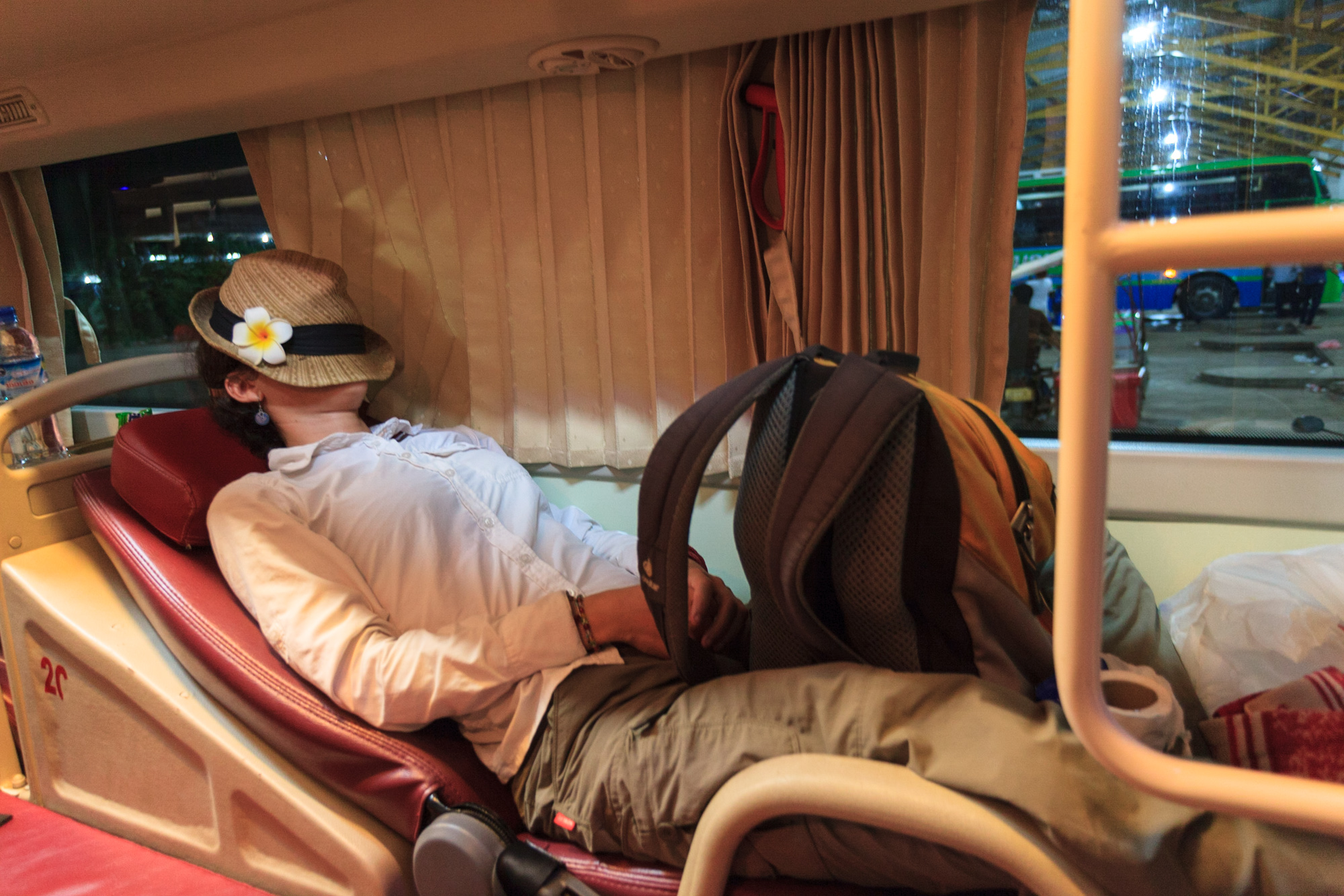 Write comment (0 Comments)Nous prenons le bus de nuit pour nous rendre à Luang Prabang. Le bus a une configuration très spéciale: des sièges inclinés en simili-cuir de 70 cm de largeur sont installés sur trois rangées et deux étages. On ne peut y monter que déchaussés. Cependant, cette mesure destinée à maintenir un minimum d'hygiène se révèle inefficace car un simple passage dans les toilettes (restées aux normes asiatiques, elles) entraine irrémédiablement une contamination par chaussettes trempées de l'intégralité des allées du bus...