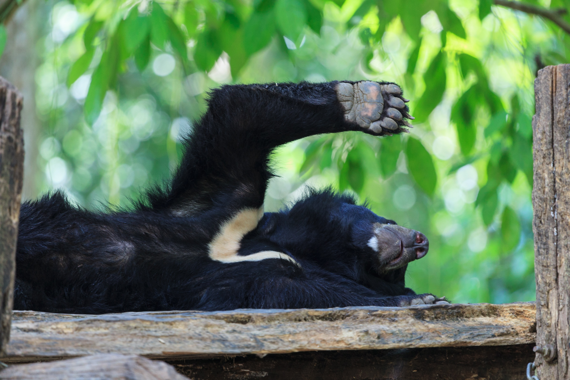 Le parc naturel recueille aussi des ours bruns du Laos affichant un beau collier blanc qui sont manifestement accablés par la chaleur.
