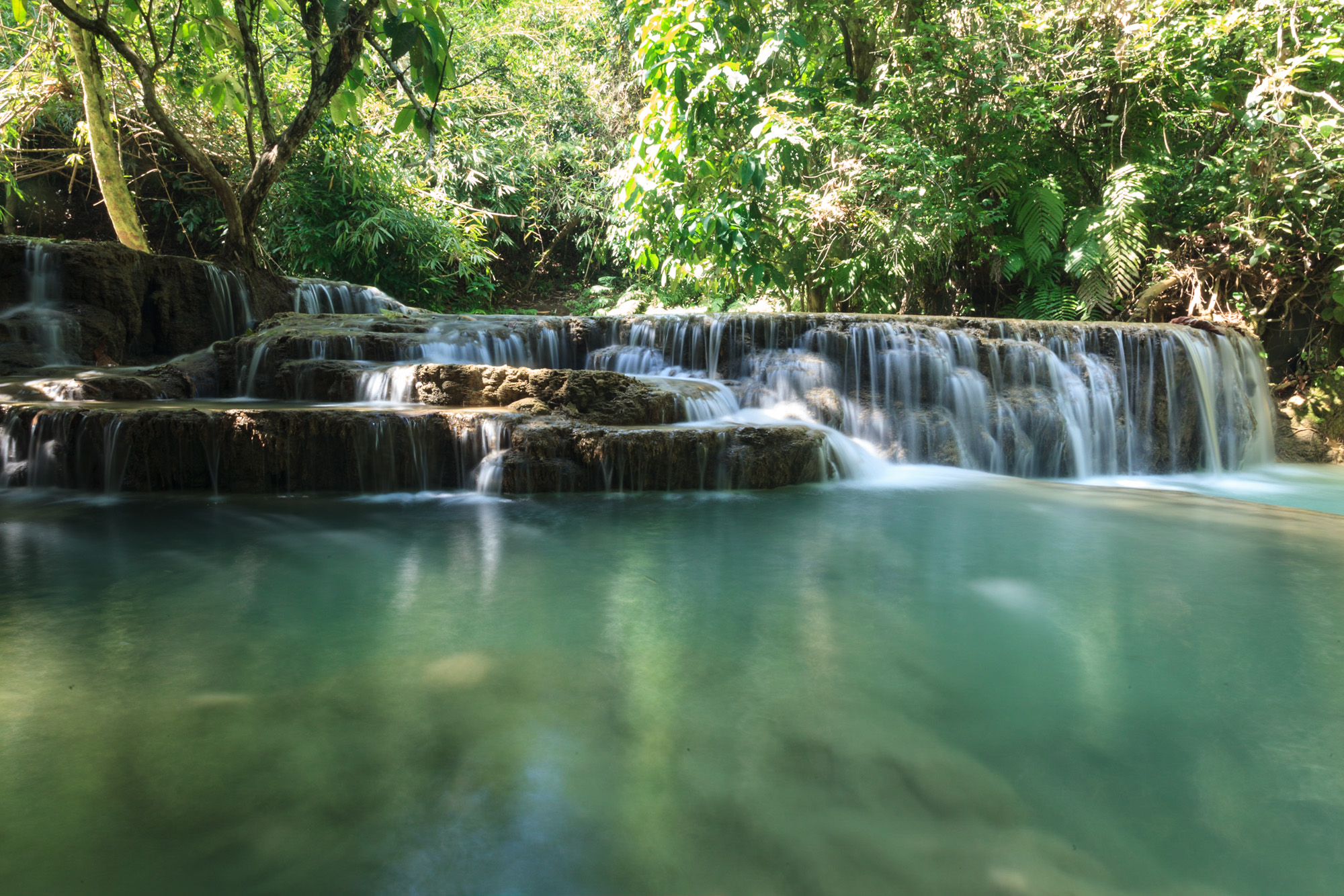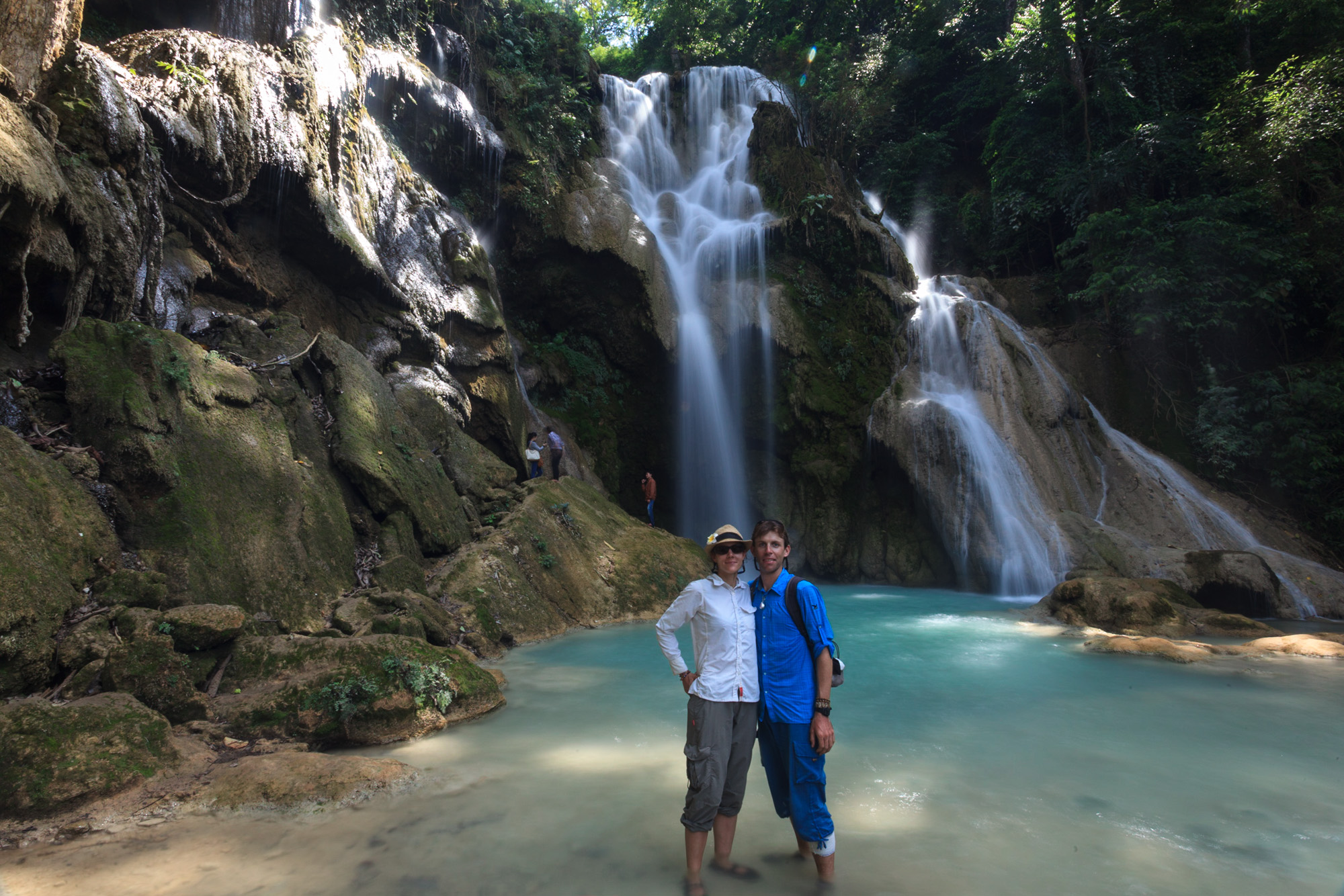 Nous continuons en direction de LA perle des chutes du Laos. Les eaux turquoises du Kouang Xi, qui ont échappé à la sécheresse, nous enchantent. Voici un endroit absolument pittoresque. De belles terrasses de calcaire qui débordent les unes dans les autres d'une belle eau claire au milieu d'une jungle luxuriante.