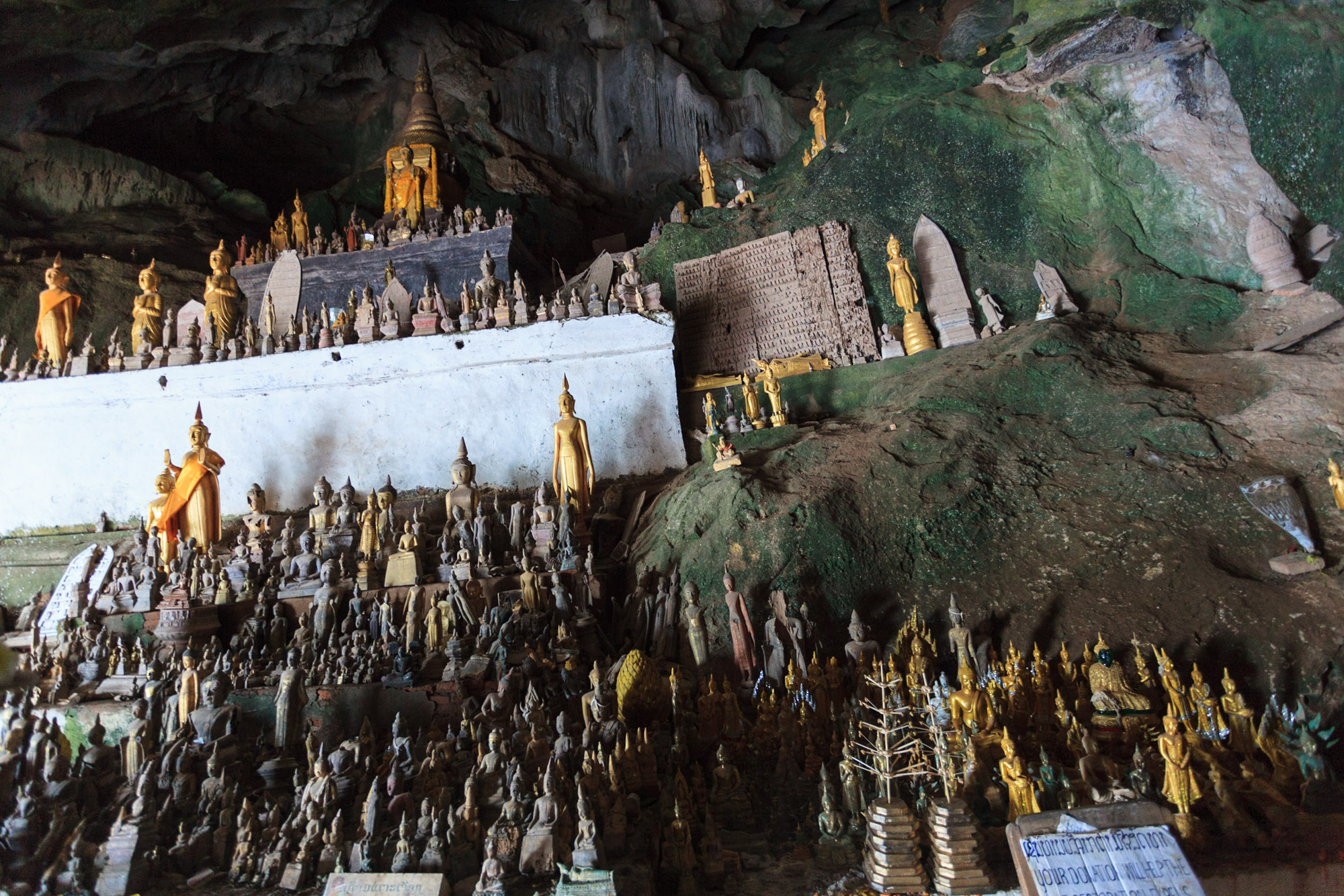 Nous terminons notre périple aux grottes de Pak Ou. Dans une falaise surplombant le Mékong, une grotte naturelle accueille des milliers de statues de Bouddha. Les fidèles y déposent régulièrement des offrandes pour remercier le Bouddha ou lui demander quelque chose...