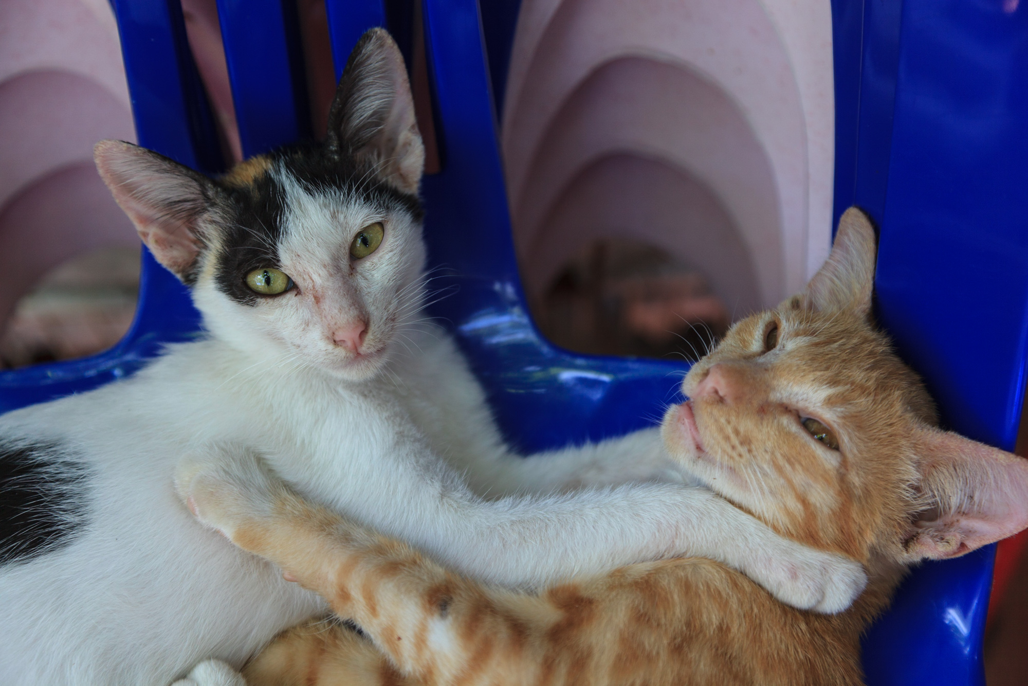 Une fois arrivés sur place (à 6h00 du mat), nous devons nous fixer des critères pour choisir notre hôtel parmi une demi-douzaine de guesthouses identiques et proposant exactement les mêmes choses (douches chaudes, free wifi, café et bananes gratuits !). Les deux petits minets qui nous accueillent en gambadant nous permettent de prendre notre décision.