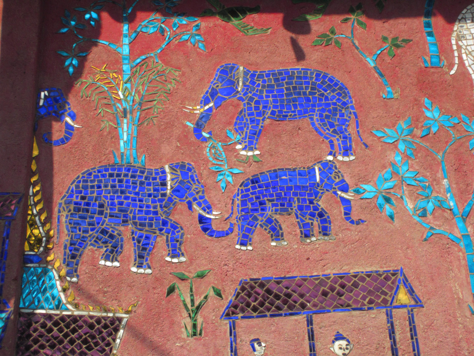 Les murs extérieurs sont tapissées de mosaïque en pâte de verre: animaux sacrés, arbres miracles, temples et scènes de guerre. Superbes !