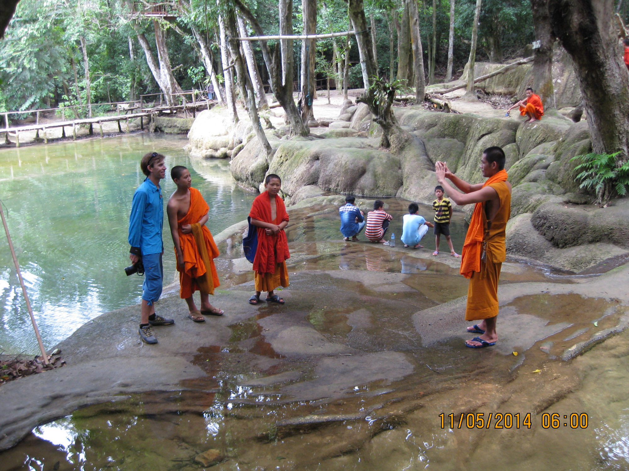 Le troisième jour nous louons une mob' pour aller explorer les environs. La campagne alentour recèle en particulier des chutes d'eau au design particulier. Malheureusement, nous sommes à la fin de la saison sèche et notre première tentative aux chutes de Tad Sae est un fiasco. Juste après qu'on ait payé les entrées, les guichetiers nous annoncent qu'il n'y a pas d'eau. Assez frustrant. Nous jetons un coup d'oeil au bout du sentier pour nous faire notre propre idée: pas une goutte en effet. De jeunes moines qui se sont sans doute aussi fait avoir tiennent absolument à faire des photos avec Nicolas.