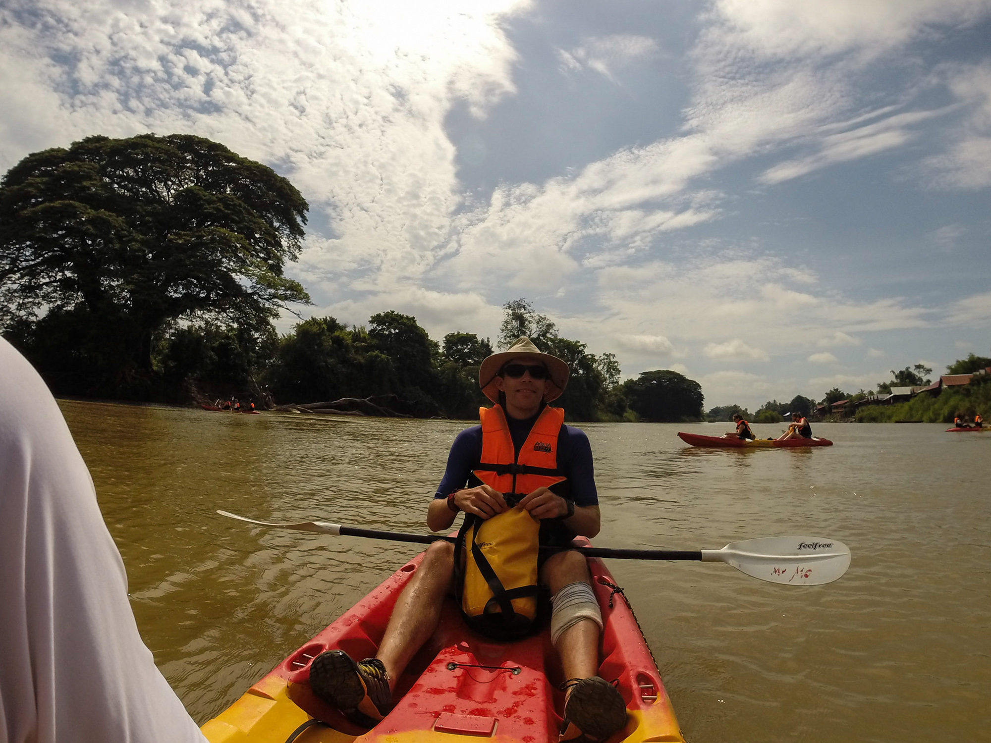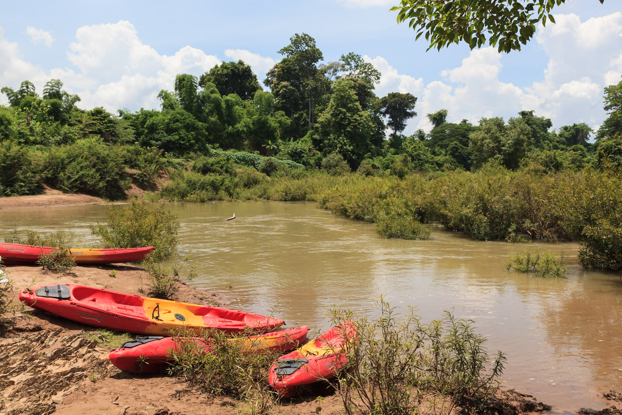La journée kayaking se révèle très joyeuse et… humide. Nous sommes abondamment arrosés par la mousson (la saison des pluies arrive lentement dans la région) et par les batailles d’eau que nous provoquons pour la plupart. En vérité, ces attaques mouillées s’avèrent salvatrices par 39°c. Surtout que, malgré le débit abondant du fleuve, l’eau du Mékong est chaude. Elle suffit à peine à nous rafraichir.