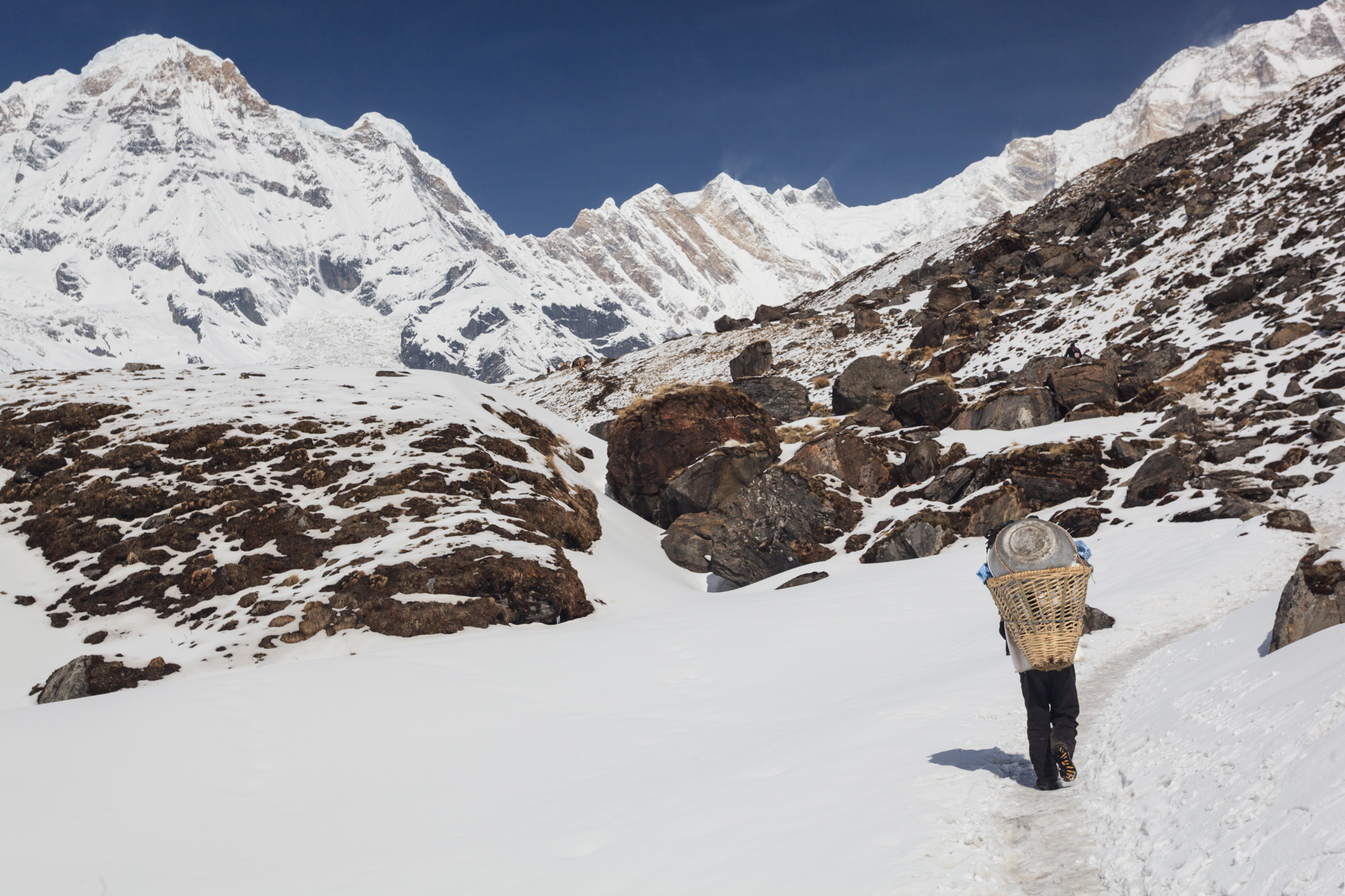 Les porteurs qui approvisionnent les lodges se servent de grandes hottes en osier pour transporter leurs marchandises. La hotte est reliée au porteur par une courroie qui se pose sur le front. Il y a aussi les porteurs des sacs de trekkers qui sont partis en agence. Eux aussi se servent de leur front pour supporter le poids des sacs, que ces derniers soit équipés de bretelles ou pas. Tout le poids repose sur les cervicales et le crâne. Chez les porteurs âgés, la courroie a laissé un renfoncement dans le front. La plupart sont mal chaussés de tongs, de sandales en pneu ou de petites chaussures en toile. Et ce par tous les temps.