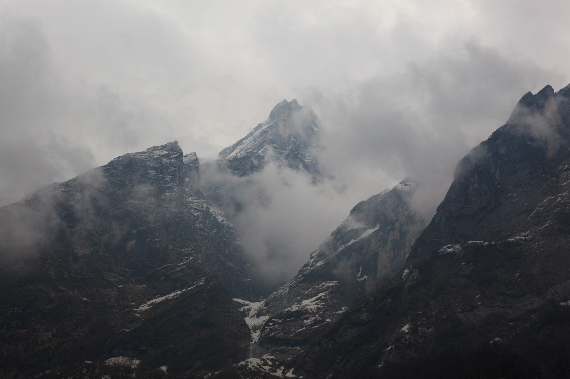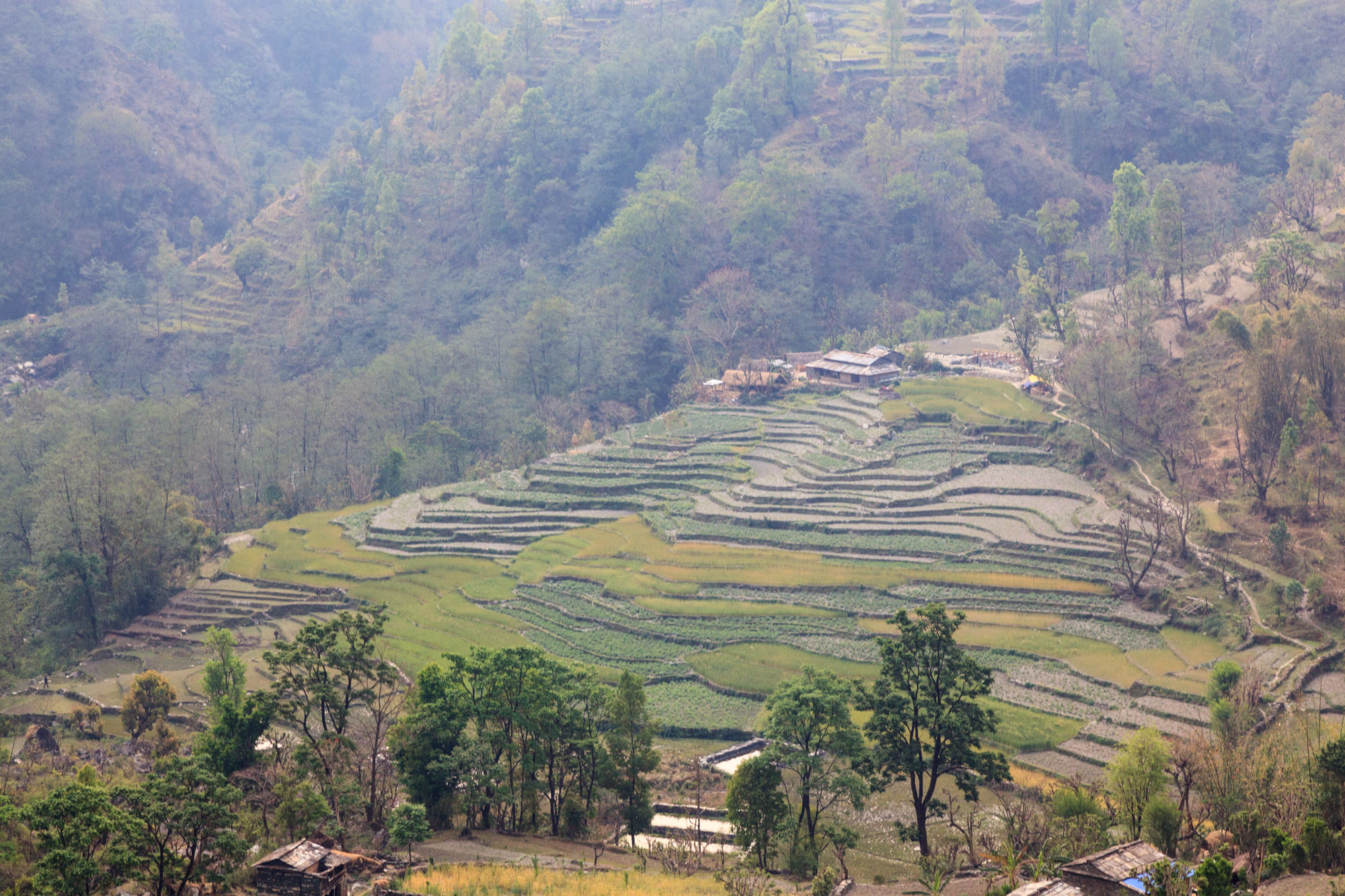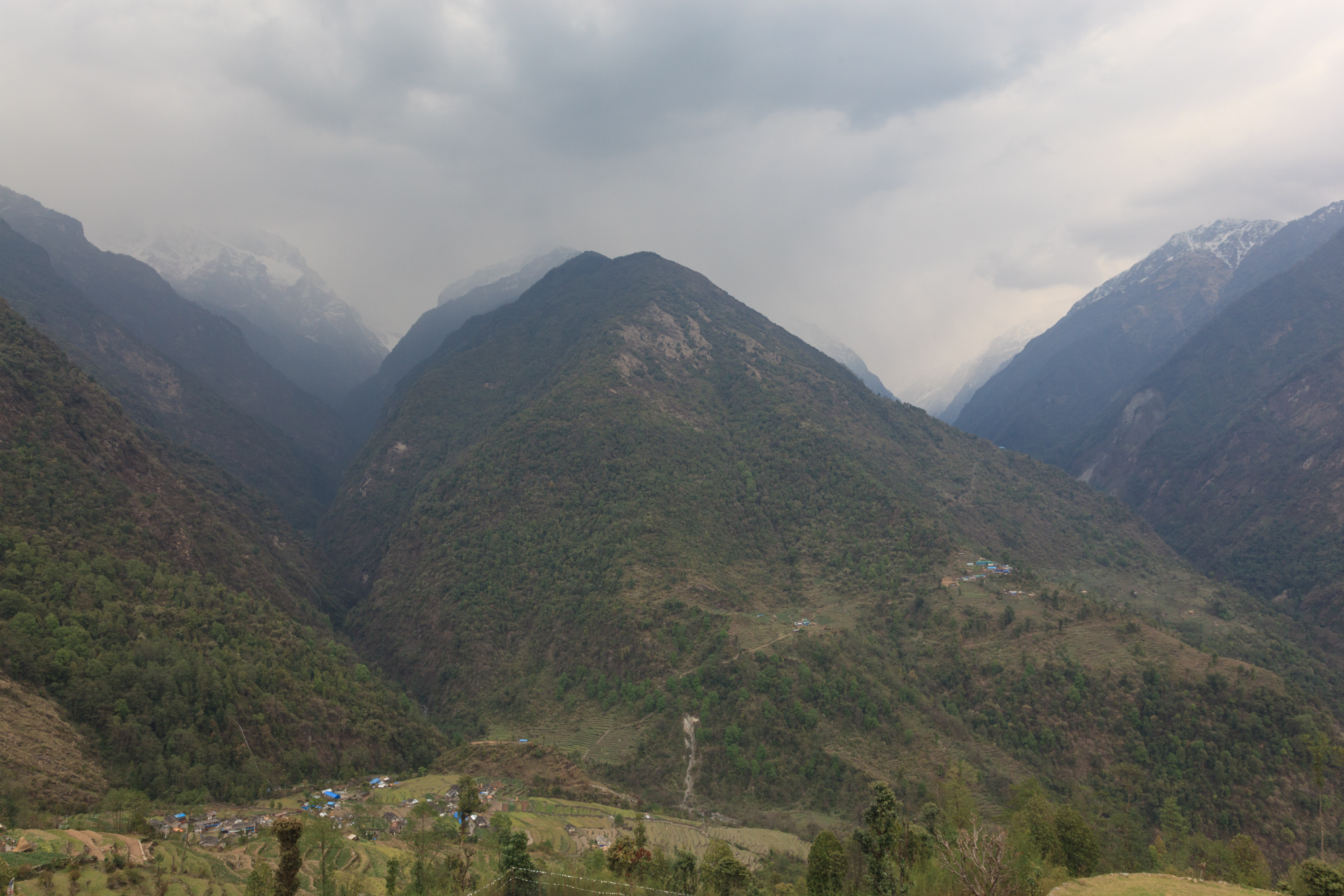 Nous traversons des paysages de terrasses cultivées de blé, descendons dans la vallée pour traverser un pont tout en bas, avant de remonter dans les villages, tout en haut. Nous arrivons dans le village de Chomrong situé à la croisée de deux vallées. L’une mène à l’Annapurna Sud, l’autre à l’Annapurna I. Malheureusement, nous ne voyons ni l’un ni l’autre, cachés dans les nuages.