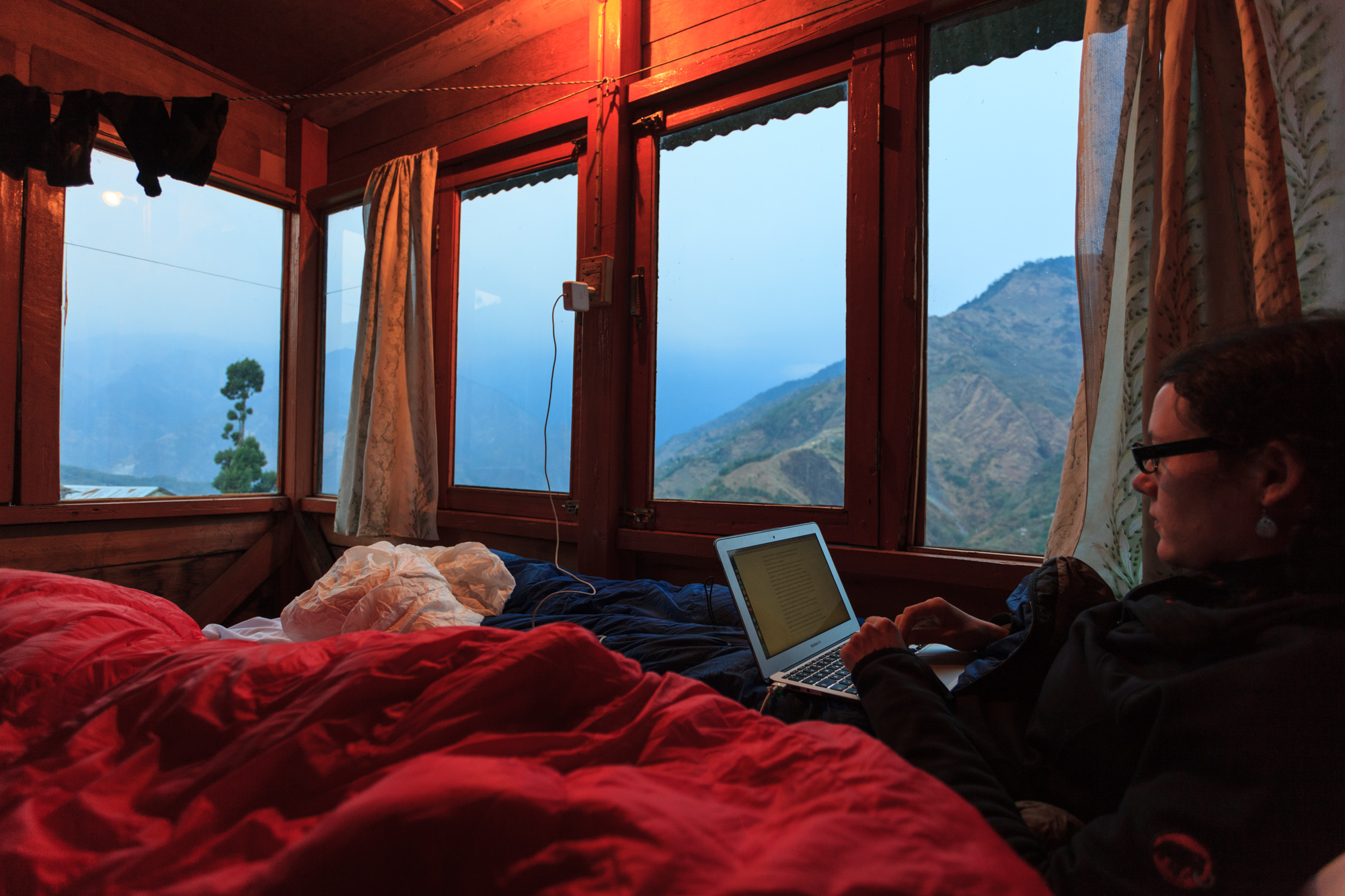 Nous arrivons sous la pluie à Tadapani, choisissons une auberge accueillante et passons une bonne soirée à parler de tout et n’importe quoi.
