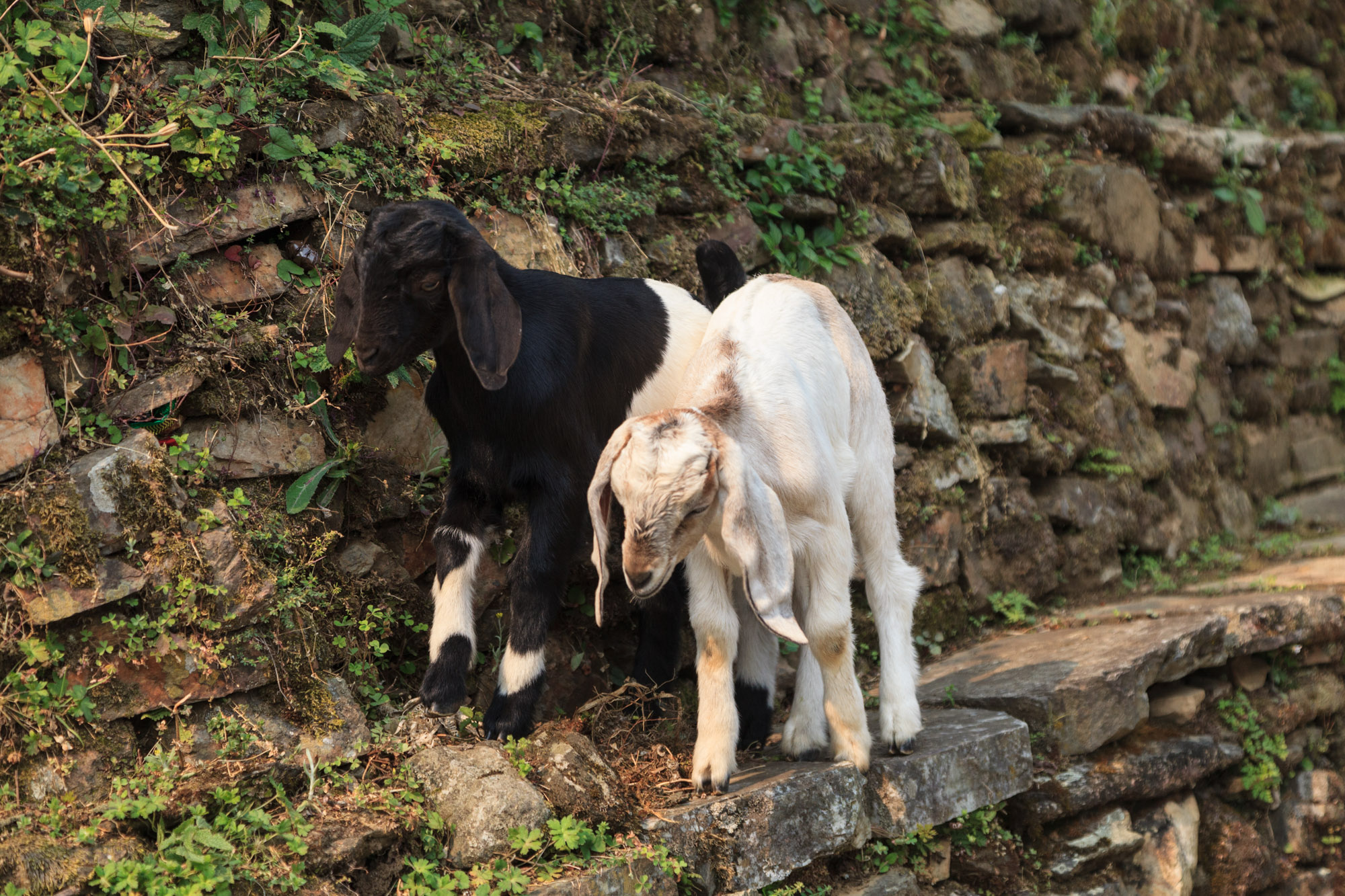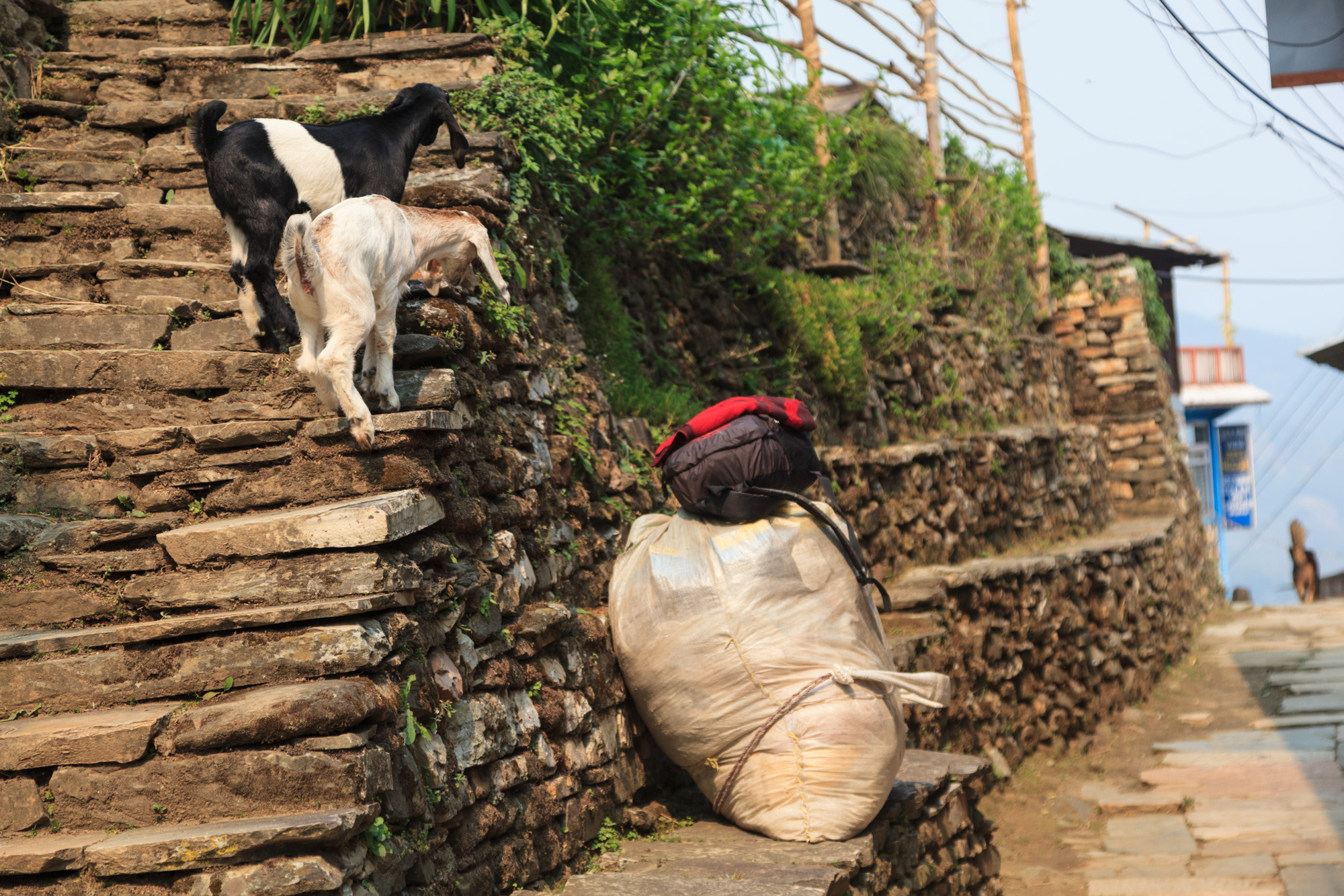 En attendant notre petit-déjeuner, nous constatons que notre chevreau de la veille a deux compagnons. Un autre chevreau identique et une petite chèvre blanche. Ca saute partout, ça se course sur le faîte des murs en pierres et sur les toits des maisons, ça met son nez partout y compris dans le sac des porteurs qui se reposent.