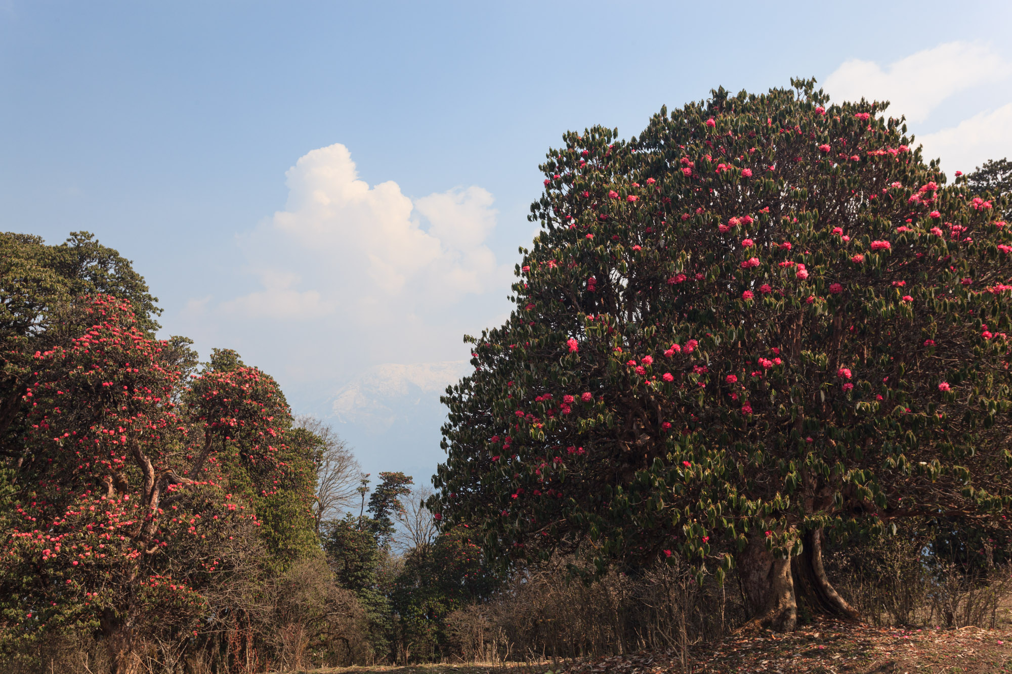 René nous accompagne sur cette étape. Nous ne restons jamais longtemps seuls sur ce trek et c’est bien comme ça. Nous évoluons aujourd’hui dans des paysages verdoyants. Nous traversons des forêts de rhododendrons. On devine aux branches couvertes de lichen que les arbres sont très vieux. Malheureusement, nous arrivons à la fin de la période de floraison. Cependant, des retardataires affichent ça et là leurs magnifiques couleurs rose et rouge. Le rhododendron, c’est la fleur du Népal.