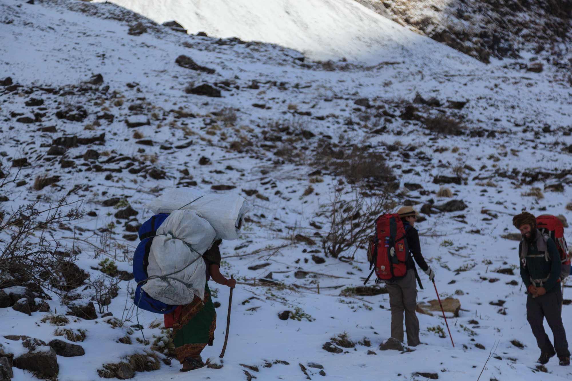 Nous effectuons nos trois heures de marche au milieu de groupes de porteurs et de porteuses. Ces gens-là forcent l’admiration. Ils transportent sur leur dos une cinquantaine de kilos de tout et n’importe quoi pour ravitailler les lodges. Cela va des cartons de Pringles aux matériaux de construction, en passant par les pommes de terre, la bouteille de gaz qui permet de chauffer l’eau de la douche. Pas étonnant qu’elle soit payante !