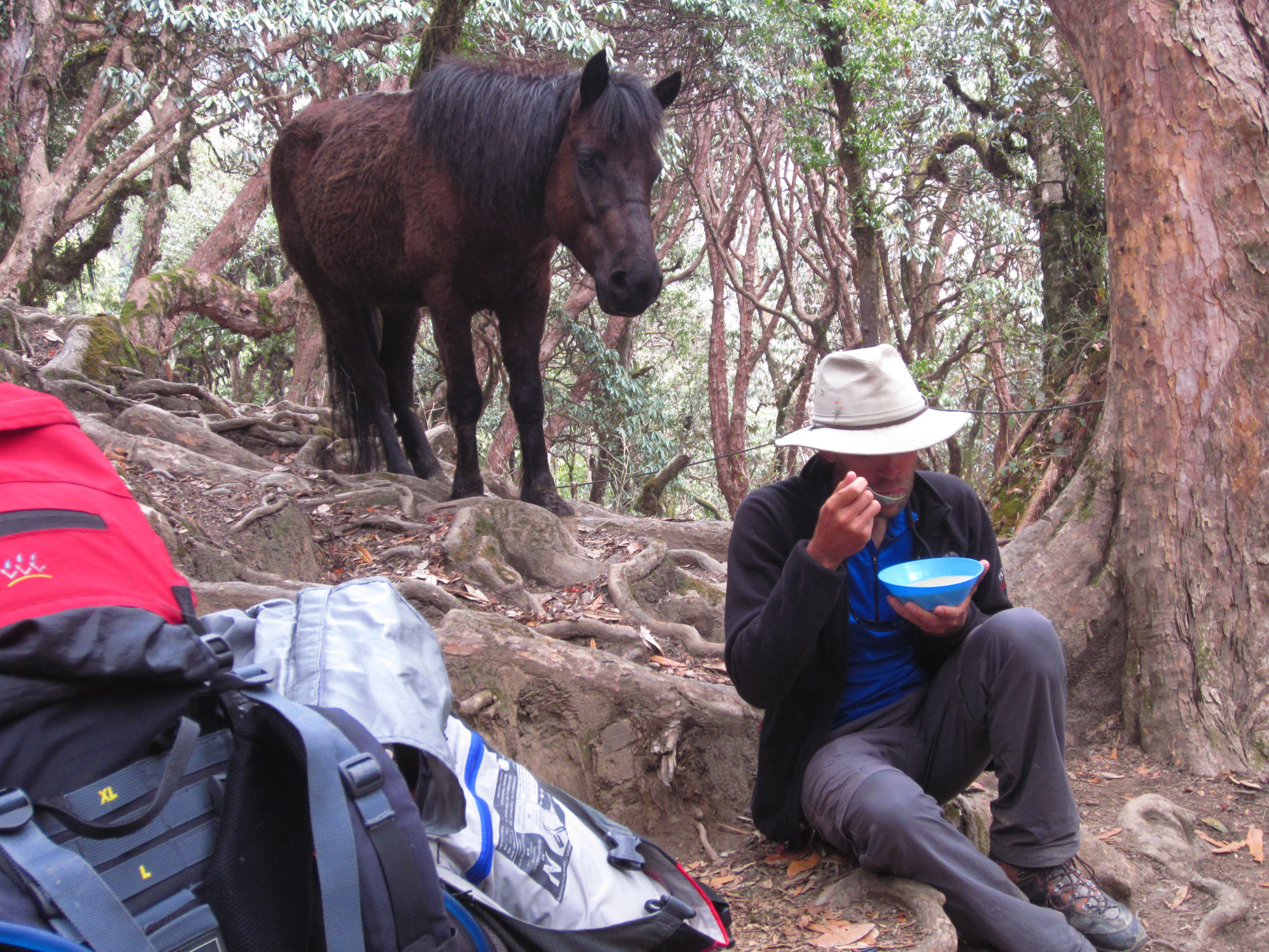 Il se rapproche et tente d’inspecter le sac de Nicolas. Il grignote les sangles et les attaches On est bien tenté de lui mettre nos deux sacs sur le dos. On le menace aussi de le transformer en tartare…en vain. A la fin du déjeuner, nous lui accordons tout de même quelques gâteaux supplémentaires.