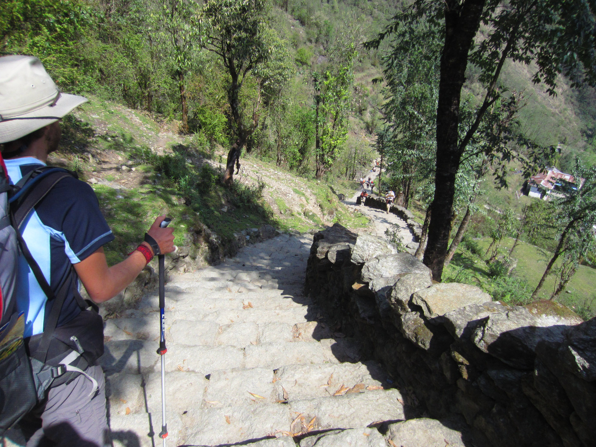Nous entamons la descente des terribles escaliers de Chomrong car avant de monter, ici, il faut descendre. Plus de 2200 marches irrégulières. Une torture pour les mollets et le moral. Le relief népalais est désespérant.