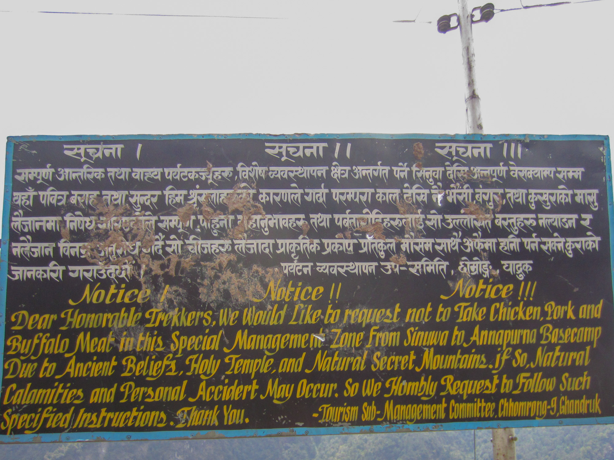 Le panneau de Sinuwa précise qu’en raison de vieilles croyances, il est interdit de consommer de la viande de poulet, de porc ou de bovin dans cette vallée. Heureusement, nous avons des soupes aux champignons et des nouilles chinoises aux légumes. Un peu plus loin, un autre panneau indique qu’il est aussi interdit de déféquer en dehors des toilettes des lodges et de cracher. Là, on touche à un point sensible. Les Népalais sont des champions du crachat. A longueur de journée, nous sommes bercés par le doux bruit du raclement de gorge qui se termine par un gros molard bien visqueux par terre. Ca va vraiment être dur pour eux !