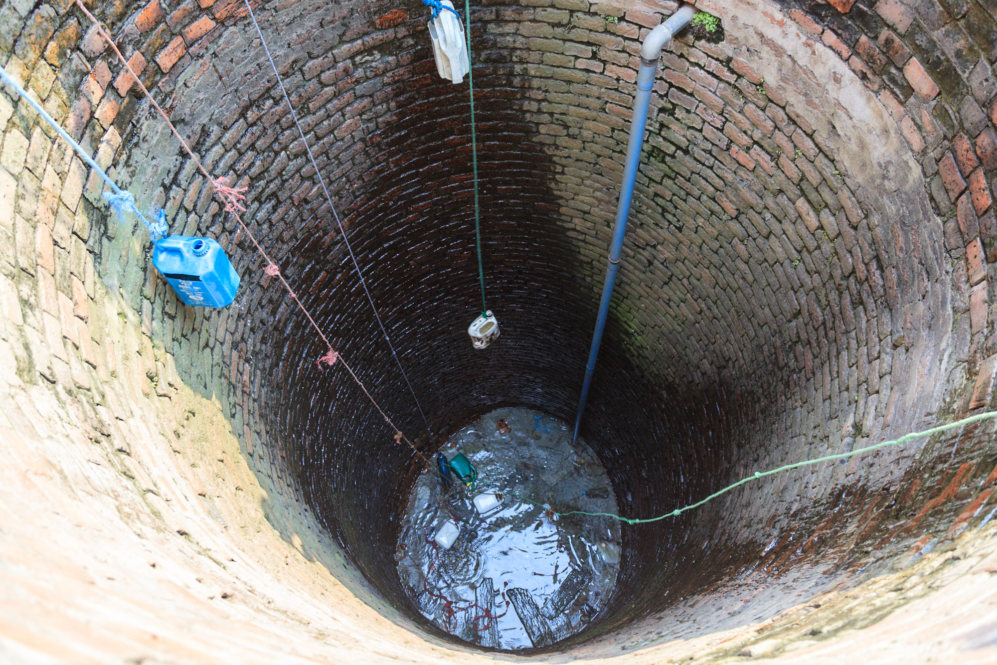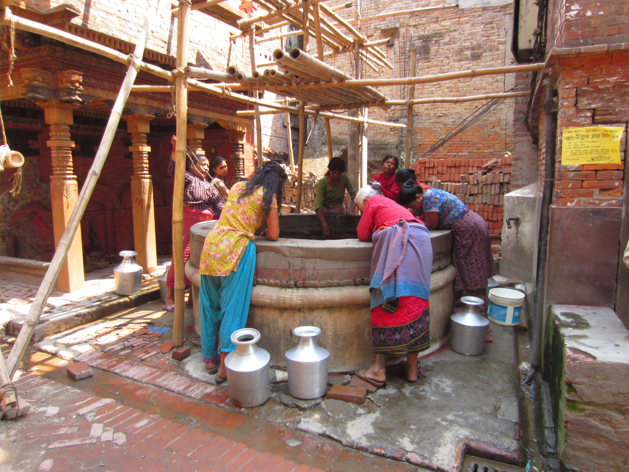 Il n’y a pas d’eau courante à Bhaktapur à part dans les hôtels touristiques. De plus, nous sommes en plein milieu de la saison sèche et les puits sont presque à sec. Les femmes jettent dans le trou des jerricans en plastique découpés, elles draguent dans le fond du puits les quelques dizaines de centimètre de profondeur d’eau qu’il reste et remontent le tout à l’aide d’une corde. Le puits fait bien ses 25 m de profondeur.