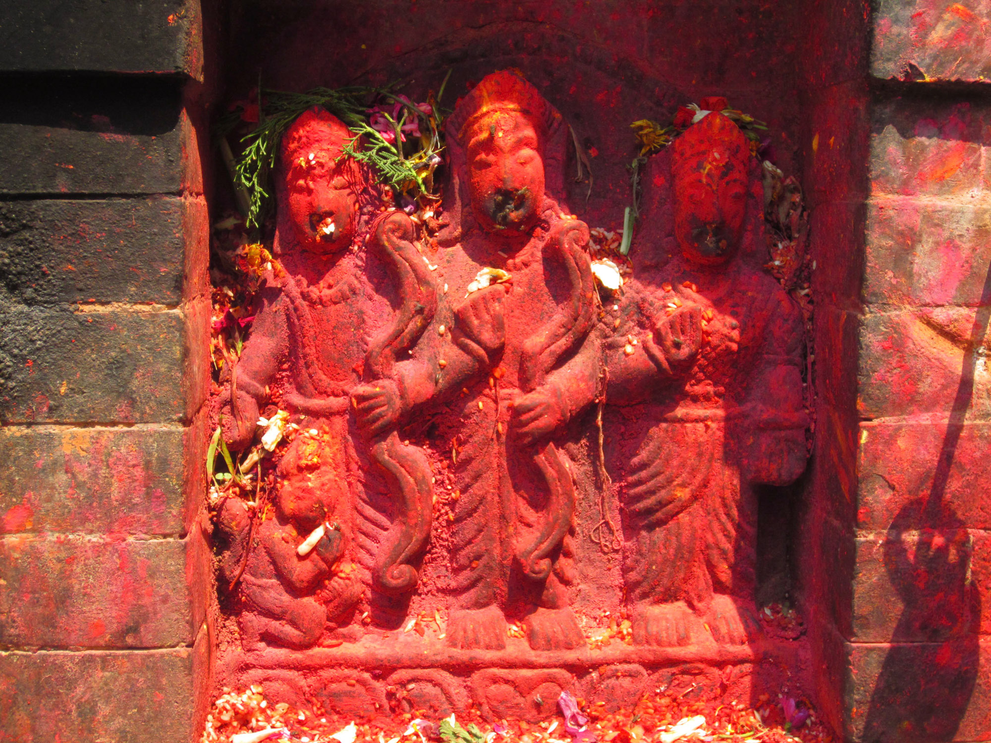 Encore plus qu’à Kathmandu, on sent la dévotion des habitants de Bhaktapur. Partout, des autels, des statues, des rochers sont colorées de pigments et de pétales de fleurs. Certaines statues sont complètement recouvertes de rose et de rouge.