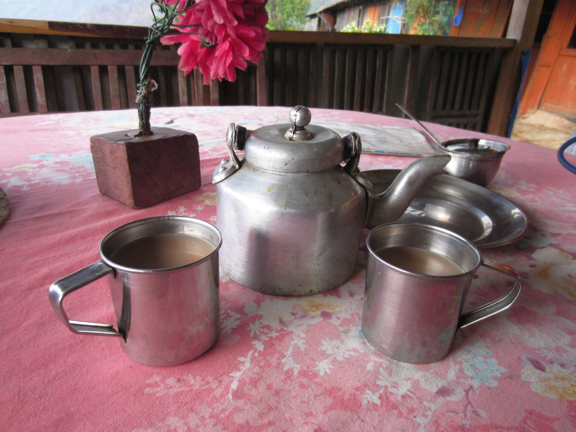 Rien que le titre est un oxymore. Le Népal est de loin le pays où nous avons le plus mal mangé. Malheureusement, la très importante influence indienne dans la culture népalaise n’est pas arrivée jusqu’aux cuisines. A part le piment utilisé souvent de façon abusive, les délicieuses épices ont disparu des plats, les légumes aussi.