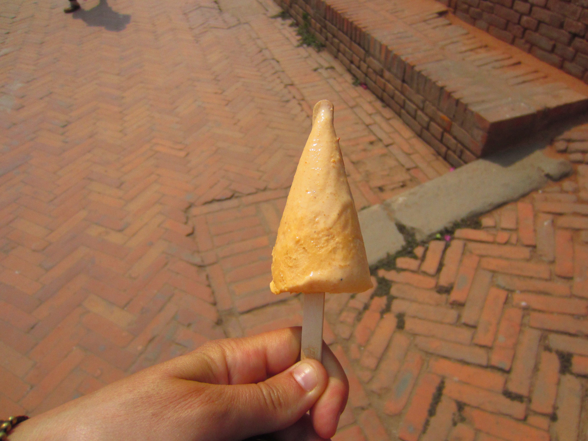Un bâton glacé en forme de cône renversé. Celui-ci était au gout de safran ! Calorique et original. Une glace au goût de fleur.