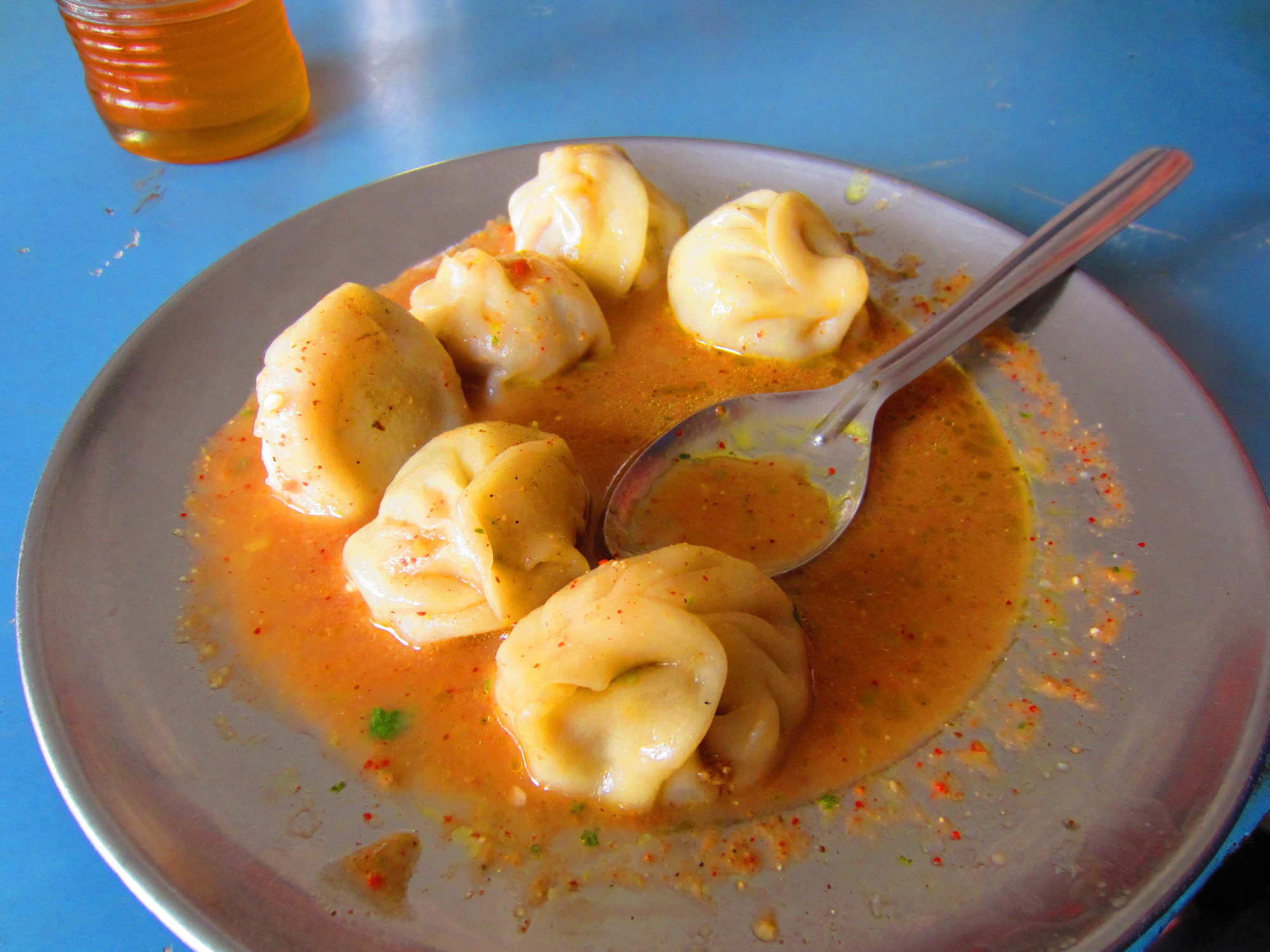 Une sorte de ravioli fourré à la viande et aux herbes ou de fromage et de pommes de terre ou, encore, de choux et carottes. Le tout est cuit à la vapeur dans d’immenses cuiseurs en fer blanc. Les Momos sont servis avec une sauce/soupe épicée.