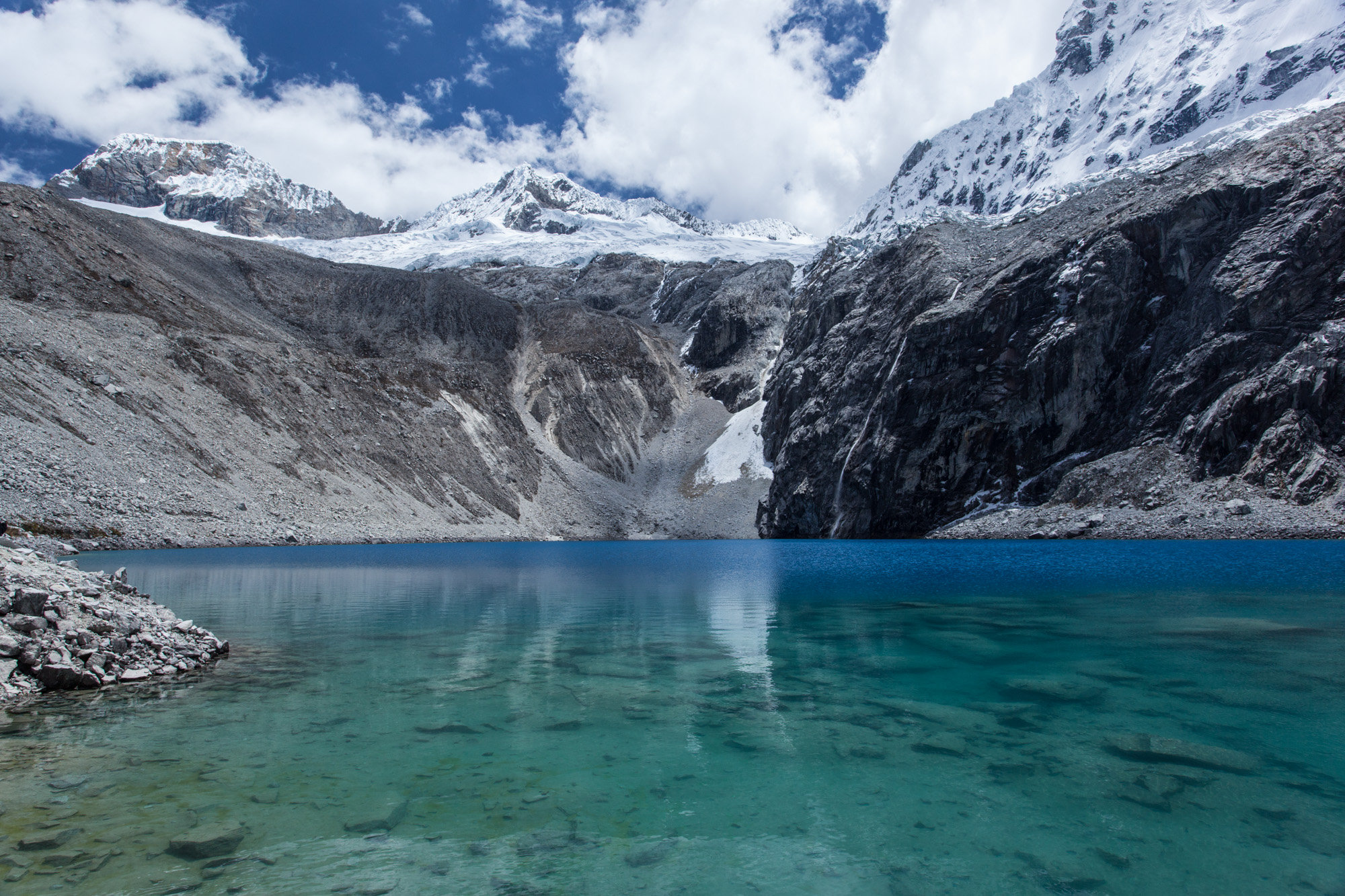 Pour booster notre production de globules rouges, nous devons effectuer plusieurs randonnées à haute altitude. Nous réalisons nos galops d’essai lors de deux ascensions dans les Cordillères Noire et Blanche. La montée au lac de Wilcacocha (3700 m) présente peu d’intérêt, à part celui de réactiver nos muscles ramollis et de discuter longuement avec notre guide sur la société péruvienne. L’expédition à la Laguna 69 (4600 m) nous permet véritablement de comprendre le sentiment de la carpe qu’on sort de l’eau ainsi que d’expérimenter le cortège de symptômes liés au mal d’altitude (ici, on appelle cela le Soroche). Maux de tête, vertiges, coeur qui bat la chamade après deux pas, nausées… Les 200 derniers mètres conduisant au lac 69 sont une vraie torture. Fort heureusement, le lac ainsi que son environnement sont absolument magnifiques.