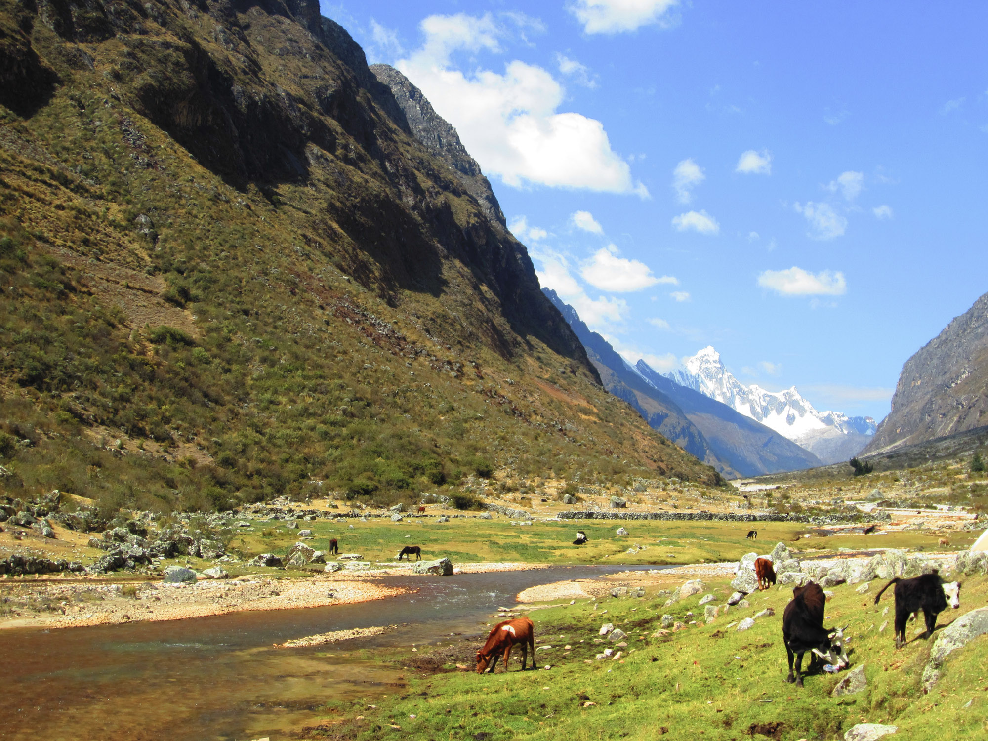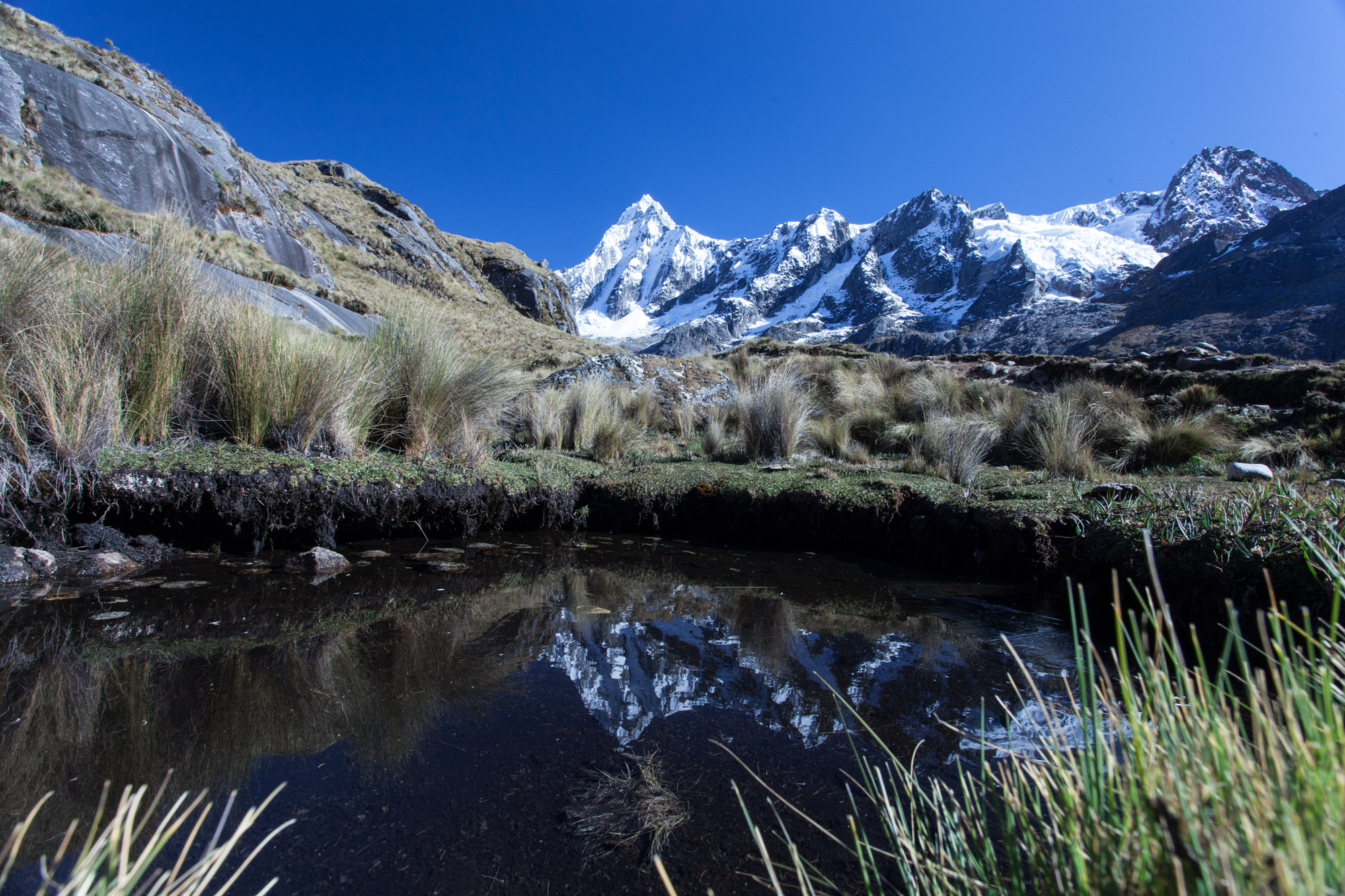 Le lendemain, nous manquons de perdre nos doigts dans la gelée blanche du matin. Aujourd’hui, nous devons passer le col de Punta Union. L’ascension dure 4 heures jusqu’à cette cassure dans la crête sommitale qui nous donne accès à l’autre vallée. La déception de la vieille concernant le paysage laisse place à l’émerveillement. Les herbes prennent des teintes dorées. Les sommets de plus de 6000 m se dévoilent. Leurs arêtes acérées se découpent sur fond de ciel bleu. Des petits lacs de montagne ajoutent de la couleur au tableau.