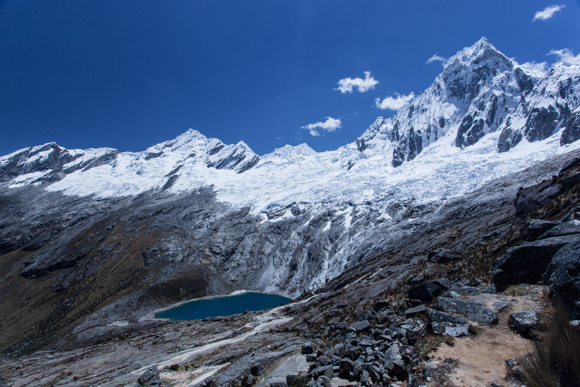 Le spectacle qui s’offre à nous est magnifique. La Cordillère s’étale sous nos yeux. Des glaciers qui se trouvent aux pieds des sommets alimentent des lacs d’un bleu splendide en contrebas.