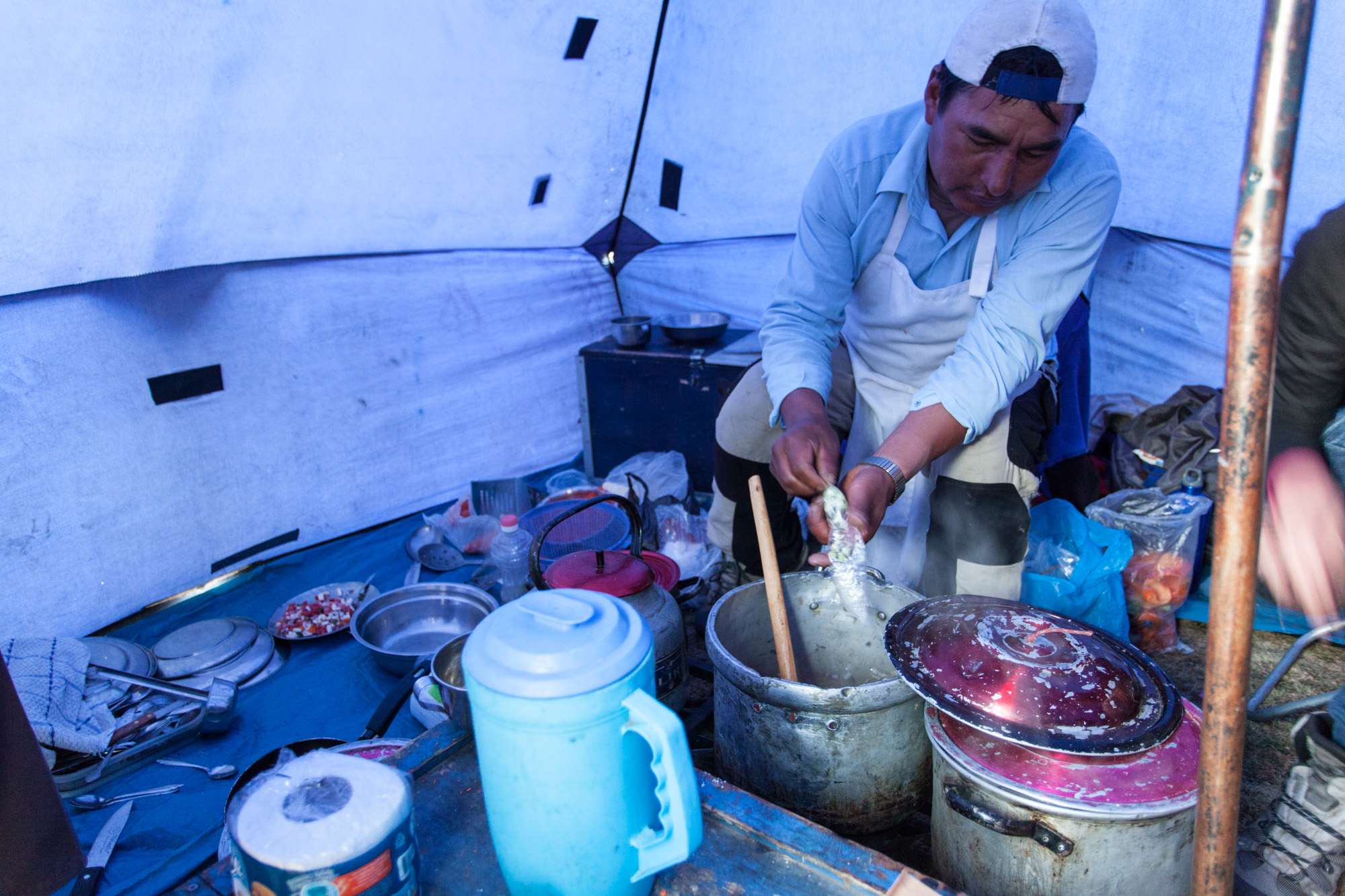 On accède au début du trek par une piste au cheminement improbable. Cinq heures de tangage au bord du précipice dans une ambiance saturée de poussière. Arrivés au village de Vaqueria, nous commençons lentement notre ascension, et faisons connaissance avec les membres de notre groupe. Les paysages de montagne que nous traversons sont arides et plutôt moroses. Le peu de végétation qui pousse est grise. La pratique de la culture sur brûlis par les paysans du coin ne contribue pas non plus à égayer les versants pelés. Nous établissons le campement à côté d’une rivière. On nous sert crackers et maté de coca dans une tente commune pour attendre le repas. Celui-ci se composera d’une soupe délicieuse et d’un plat de viande et de riz joliment décoré. A presque 4000 m d’altitude, j’ai des complexes en constatant les miracles que peut accomplir le cuisinier capable de mitonner des repas gastronomiques pour 12 personnes seulement équipé d’une cuisinière à gaz portative, de deux casseroles, d’un couteau et d’une planche à découper.
