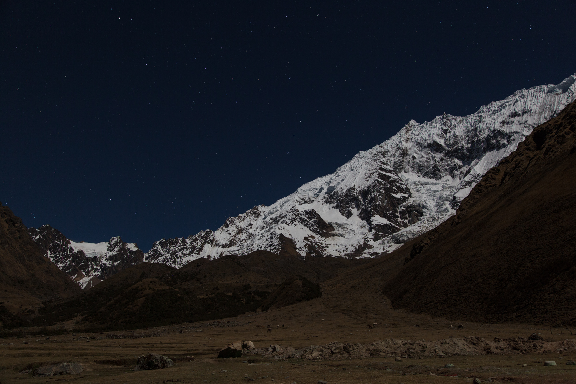 Les paysages de cette première journée de trek ressemblent beaucoup à ceux du début du trek de Santa Cruz. Montagnes grises sans végétation. La route sinueuse nous mène finalement à notre campement au pied de magnifiques montagnes. Quand le soleil se couche et que le vent se lève, le froid devient difficile à supporter. Notre guide nous déconseille, d’ailleurs, de sortir seuls de notre tente après 23h, moment ou les rafales peuvent vous faire méchamment chuter. Des accidents se sont déjà produits. Cependant, même dans ces conditions, la tentation de rester quelques moments à l’extérieur est irrésistible tant les paysages de montagne éclairées par la Lune sont magnifiques.