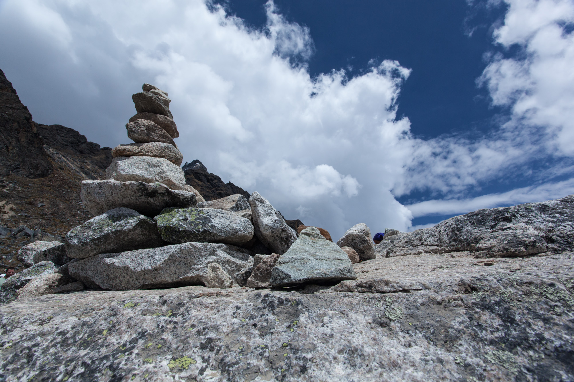 Le passage au col est l’occasion d’une cérémonie en l’honneur de la Pachamama. Le rituel, orchestré par notre guide, consiste en trois prières lancées aux vents et d’offrande sous forme de feuille de coca. Celles-ci sont placées sous une pierre ramassée le matin en bas de la montagne. C’est cette habitude andine qui a donné naissance aux Cairns, empilements de pierre qui marquent les treks de hautes montagnes et qui ont sauvé la mise à bien des randonneurs.